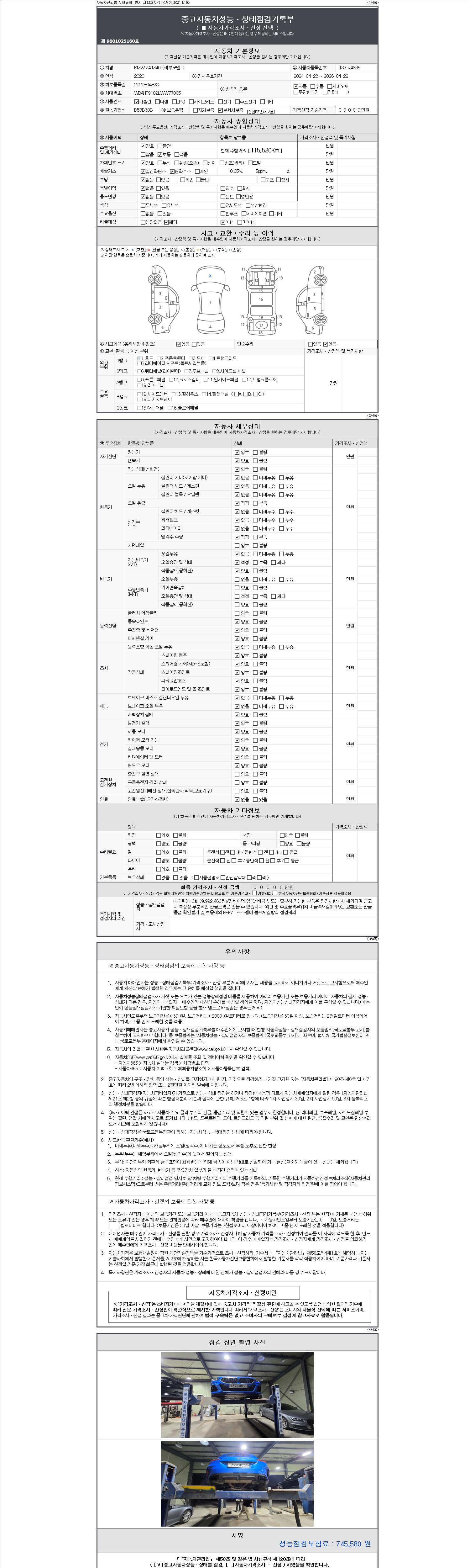 자동차관리법 시행규칙 제120조의 규정에 따라 별지 제 82호서식 《중고자동차 성능, 상태점검 기록부》를 발행한 성능, 상태점검자 및 매매자는 아래의 보증기간 또는 보증거리 이내의 중고자동차, 성능점검 기록부에 기재된 내용과 자동차의 실제 성능, 상태가 다른 경우 계약 또는 관계법령에 따라 매수인에 대하여 책임을 집니다.