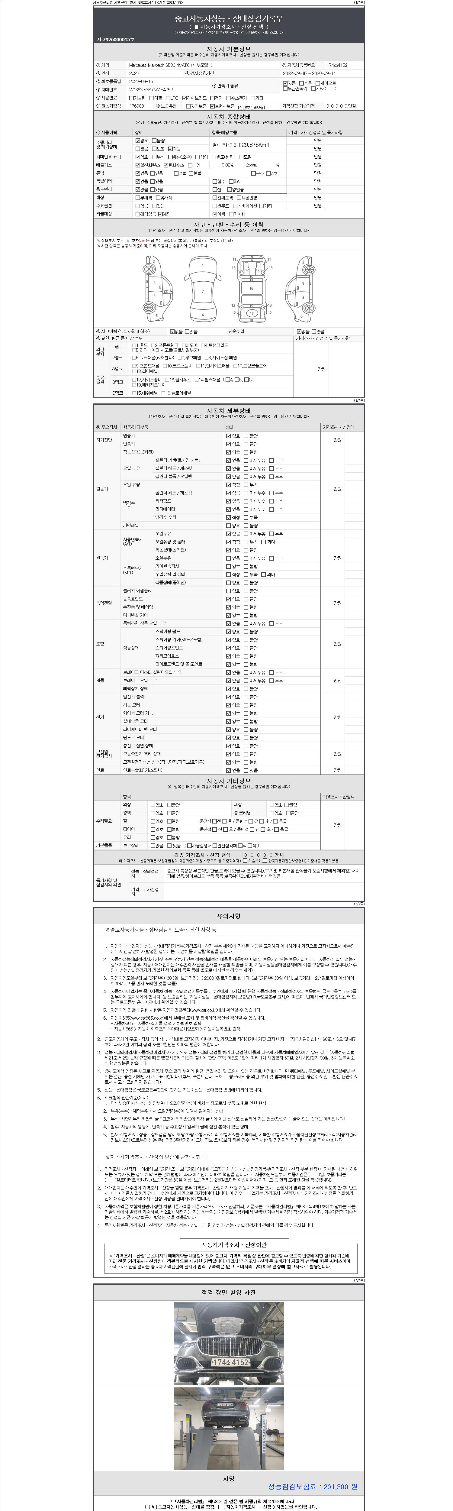 자동차관리법 시행규칙 제120조의 규정에 따라 별지 제 82호서식 《중고자동차 성능, 상태점검 기록부》를 발행한 성능, 상태점검자 및 매매자는 아래의 보증기간 또는 보증거리 이내의 중고자동차, 성능점검 기록부에 기재된 내용과 자동차의 실제 성능, 상태가 다른 경우 계약 또는 관계법령에 따라 매수인에 대하여 책임을 집니다.