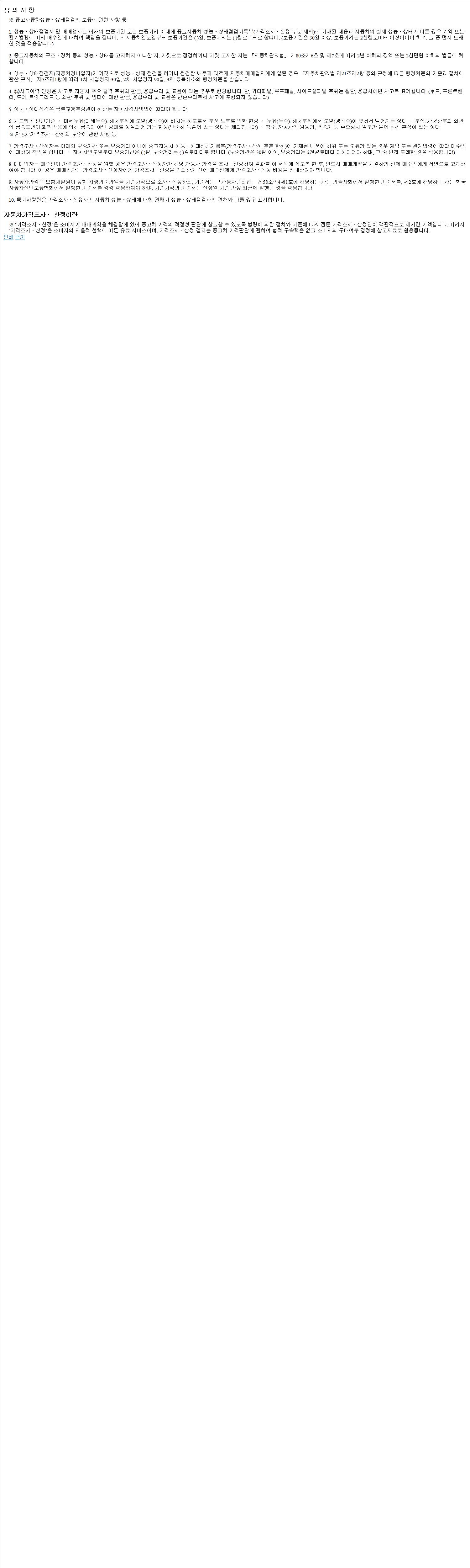자동차관리법 시행규칙 제120조의 규정에 따라 별지 제 82호서식 《중고자동차 성능, 상태점검 기록부》를 발행한 성능, 상태점검자 및 매매자는 아래의 보증기간 또는 보증거리 이내의 중고자동차, 성능점검 기록부에 기재된 내용과 자동차의 실제 성능, 상태가 다른 경우 계약 또는 관계법령에 따라 매수인에 대하여 책임을 집니다.