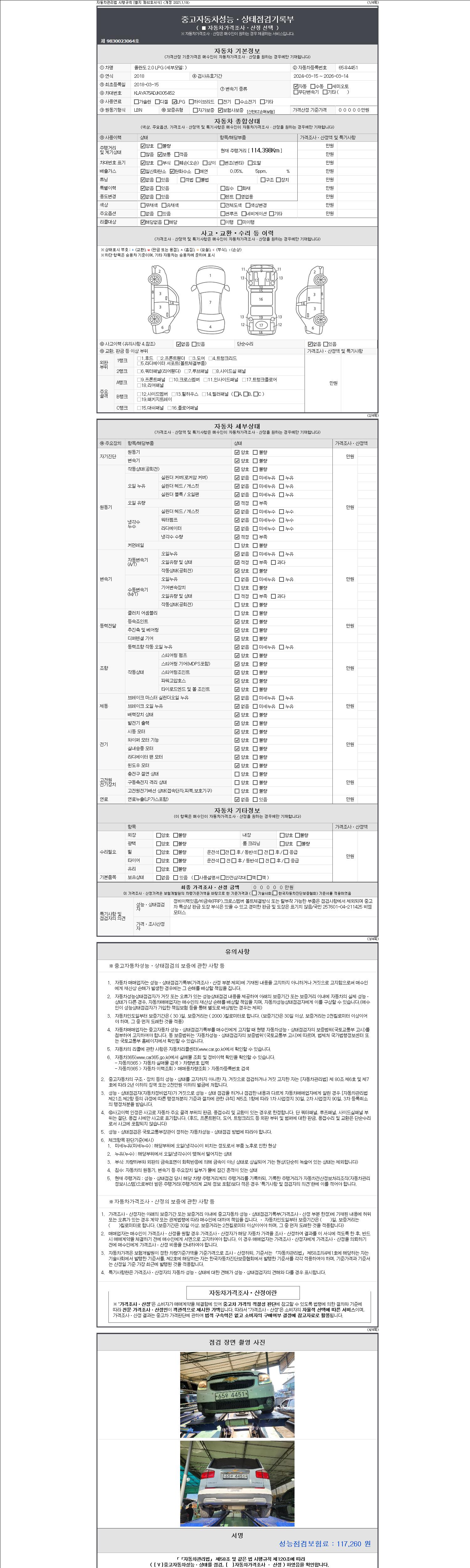 자동차관리법 시행규칙 제120조의 규정에 따라 별지 제 82호서식 《중고자동차 성능, 상태점검 기록부》를 발행한 성능, 상태점검자 및 매매자는 아래의 보증기간 또는 보증거리 이내의 중고자동차, 성능점검 기록부에 기재된 내용과 자동차의 실제 성능, 상태가 다른 경우 계약 또는 관계법령에 따라 매수인에 대하여 책임을 집니다.