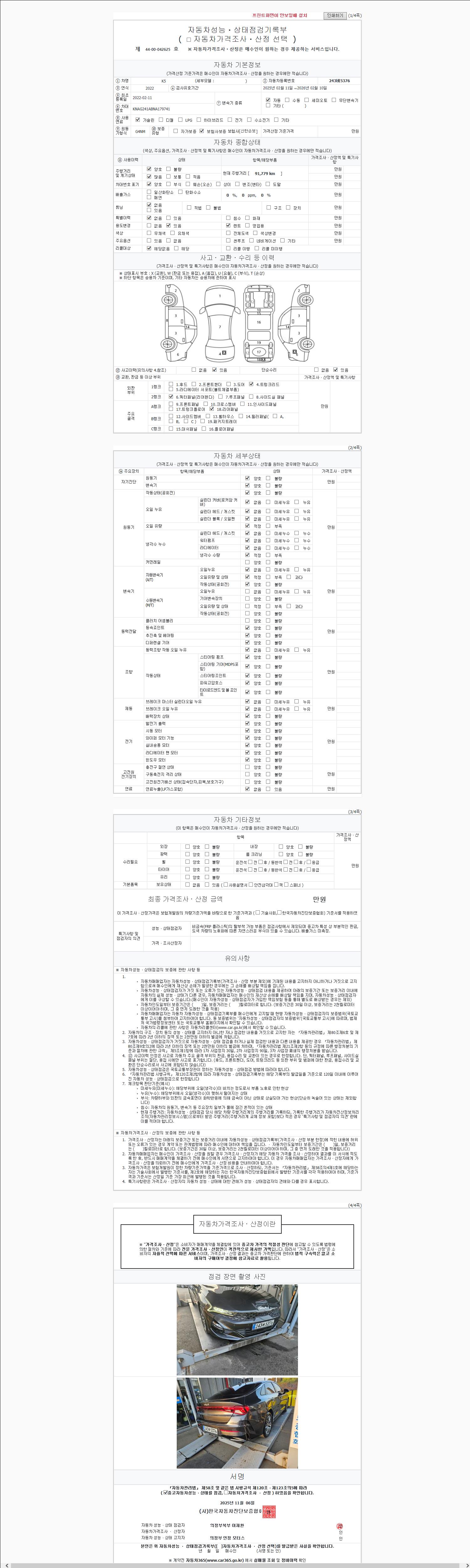 -중고자동차 매매업자를 통해 차량을 구입하실 경우 반드시 "중고자동차 성능, 상태점검 기록부"를 교뷰 받으셔야 하며, 매매업자는 반드시 의무 교부 하여야 압니다.