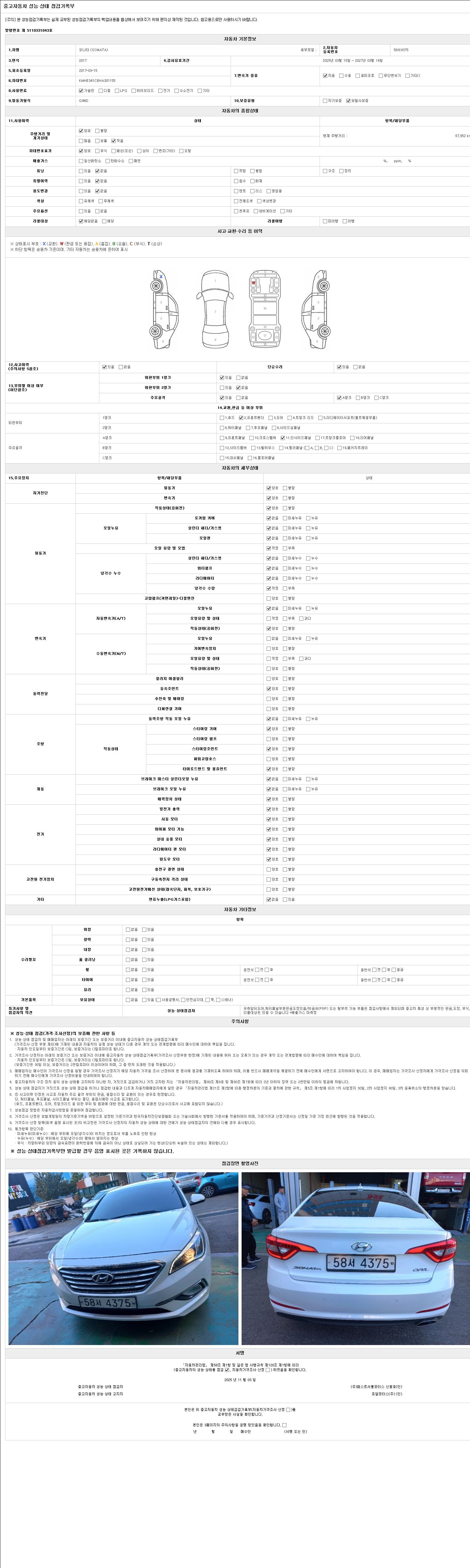 | 주행거리 | 67,952 km | 차량번호 | 58서4375 |