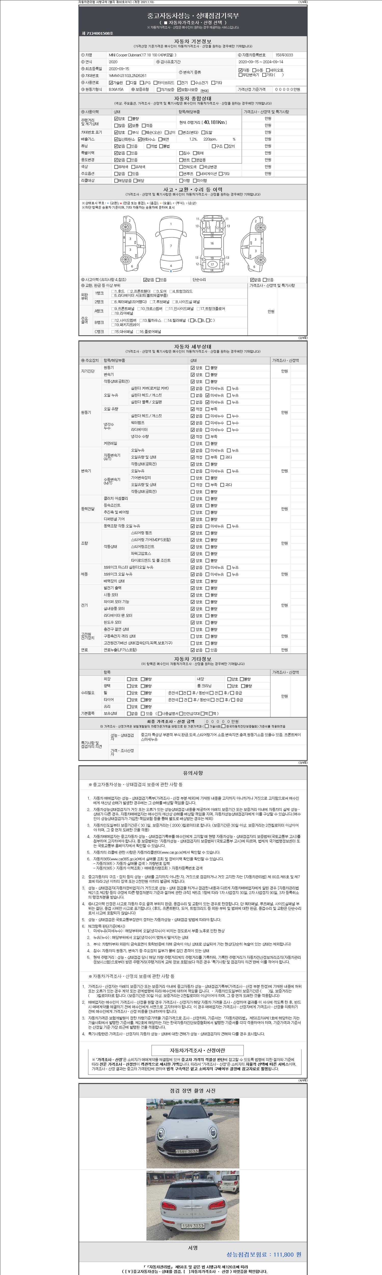 자동차관리법 시행규칙 제120조의 규정에 따라 별지 제 82호서식 《중고자동차 성능, 상태점검 기록부》를 발행한 성능, 상태점검자 및 매매자는 아래의 보증기간 또는 보증거리 이내의 중고자동차, 성능점검 기록부에 기재된 내용과 자동차의 실제 성능, 상태가 다른 경우 계약 또는 관계법령에 따라 매수인에 대하여 책임을 집니다.
