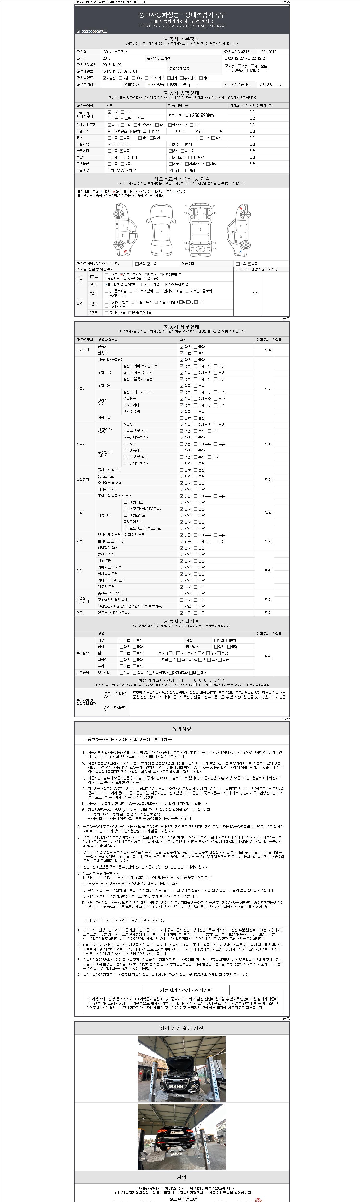 자동차관리법 시행규칙 제120조의 규정에 따라 별지 제 82호서식 《중고자동차 성능, 상태점검 기록부》를 발행한 성능, 상태점검자 및 매매자는 아래의 보증기간 또는 보증거리 이내의 중고자동차, 성능점검 기록부에 기재된 내용과 자동차의 실제 성능, 상태가 다른 경우 계약 또는 관계법령에 따라 매수인에 대하여 책임을 집니다.