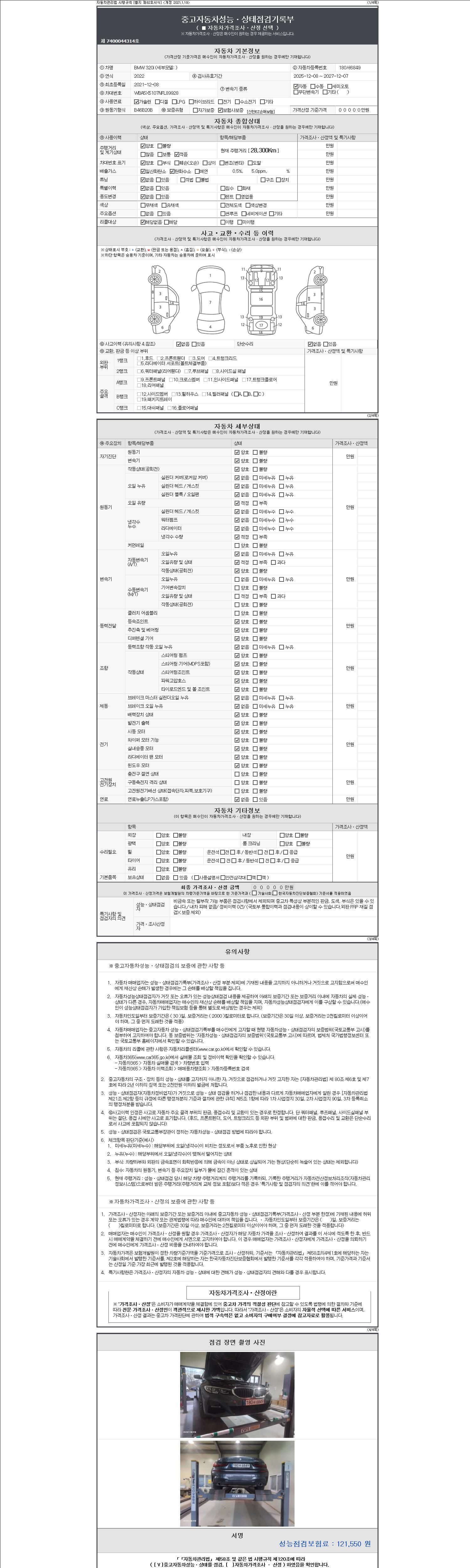 자동차관리법 시행규칙 제120조의 규정에 따라 별지 제 82호서식 《중고자동차 성능, 상태점검 기록부》를 발행한 성능, 상태점검자 및 매매자는 아래의 보증기간 또는 보증거리 이내의 중고자동차, 성능점검 기록부에 기재된 내용과 자동차의 실제 성능, 상태가 다른 경우 계약 또는 관계법령에 따라 매수인에 대하여 책임을 집니다.