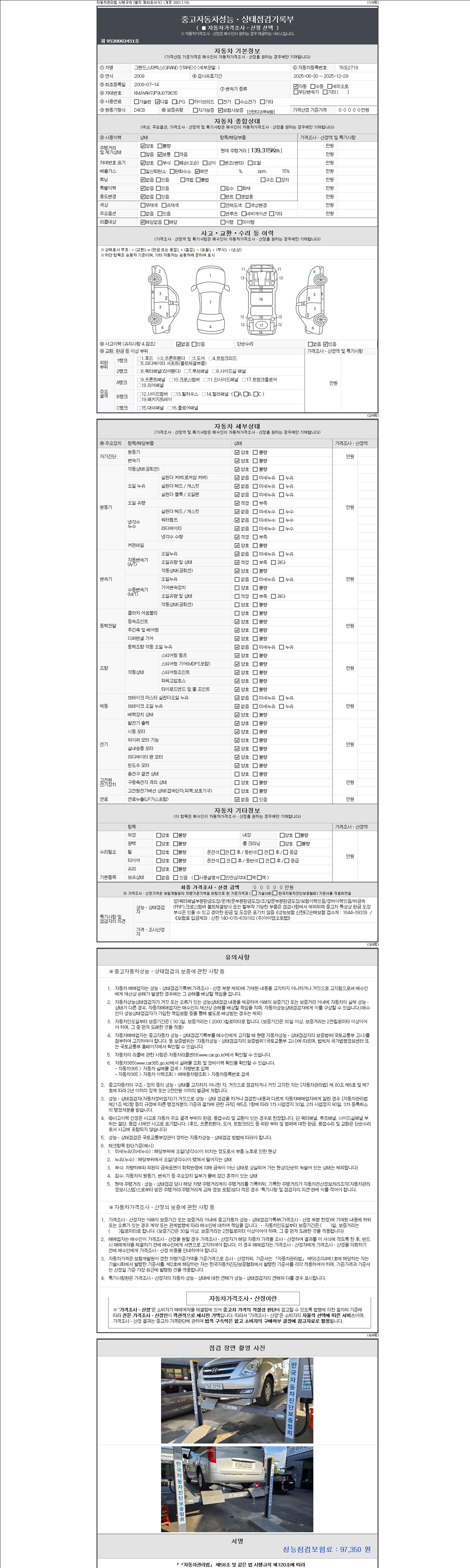 자동차관리법 시행규칙 제120조의 규정에 따라 별지 제 82호서식 《중고자동차 성능, 상태점검 기록부》를 발행한 성능, 상태점검자 및 매매자는 아래의 보증기간 또는 보증거리 이내의 중고자동차, 성능점검 기록부에 기재된 내용과 자동차의 실제 성능, 상태가 다른 경우 계약 또는 관계법령에 따라 매수인에 대하여 책임을 집니다.