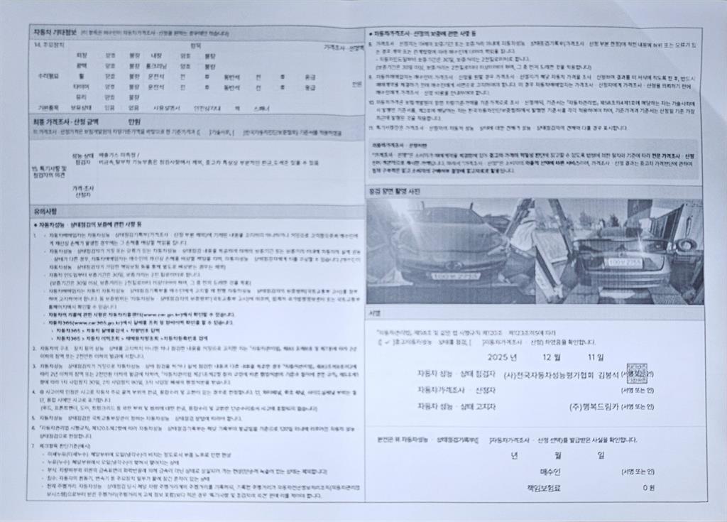 -중고자동차 매매업자를 통해 차량을 구입하실 경우 반드시 "중고자동차 성능, 상태점검 기록부"를 교뷰 받으셔야 하며, 매매업자는 반드시 의무 교부 하여야 압니다.