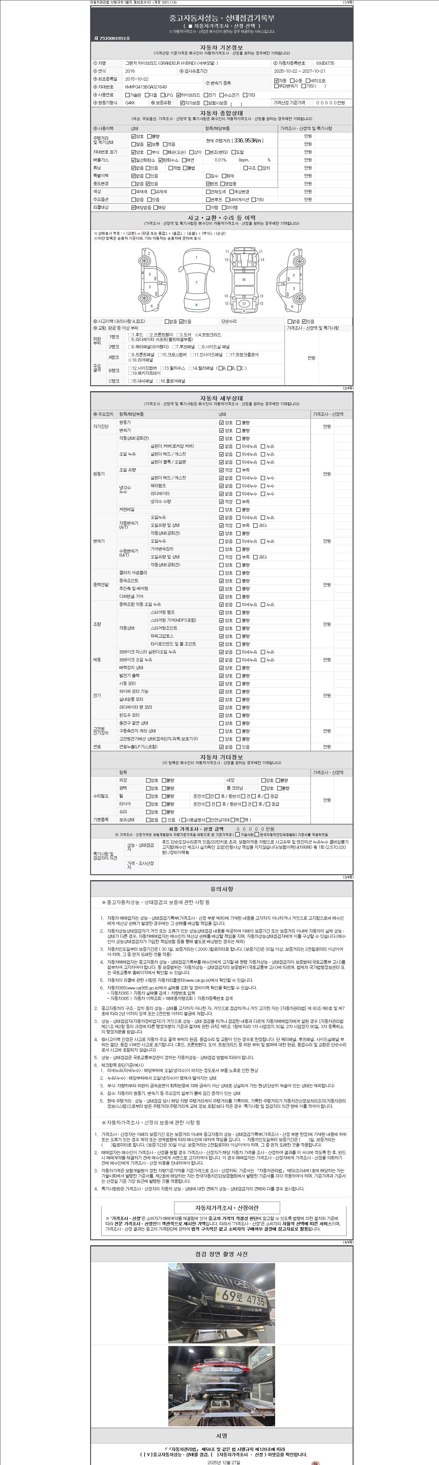 자동차관리법 시행규칙 제120조의 규정에 따라 별지 제 82호서식 《중고자동차 성능, 상태점검 기록부》를 발행한 성능, 상태점검자 및 매매자는 아래의 보증기간 또는 보증거리 이내의 중고자동차, 성능점검 기록부에 기재된 내용과 자동차의 실제 성능, 상태가 다른 경우 계약 또는 관계법령에 따라 매수인에 대하여 책임을 집니다.