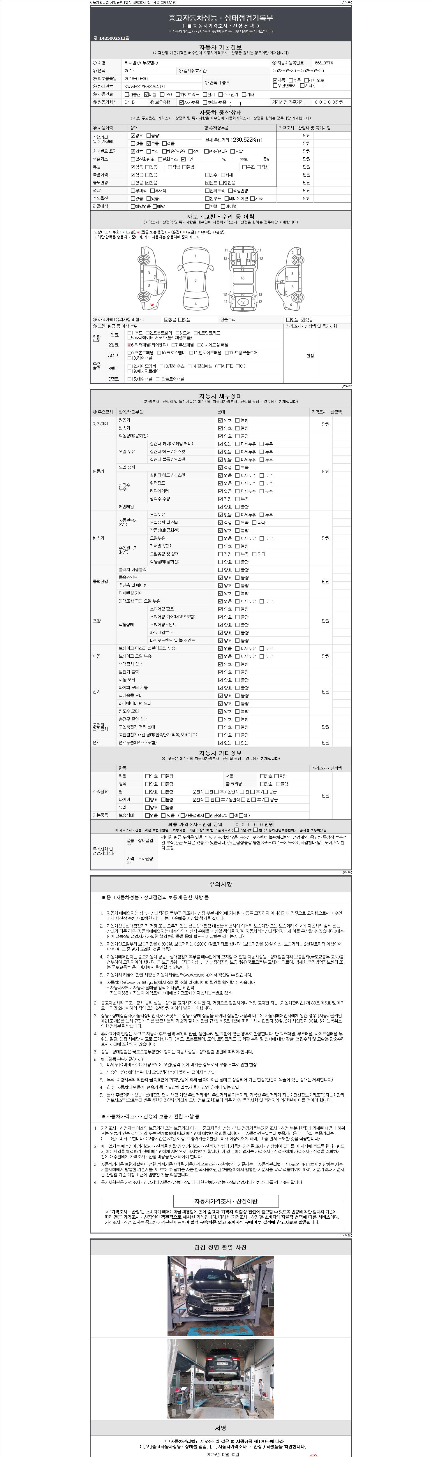 -중고자동차 매매업자를 통해 차량을 구입하실 경우 반드시 "중고자동차 성능, 상태점검 기록부"를 교뷰 받으셔야 하며, 매매업자는 반드시 의무 교부 하여야 압니다.