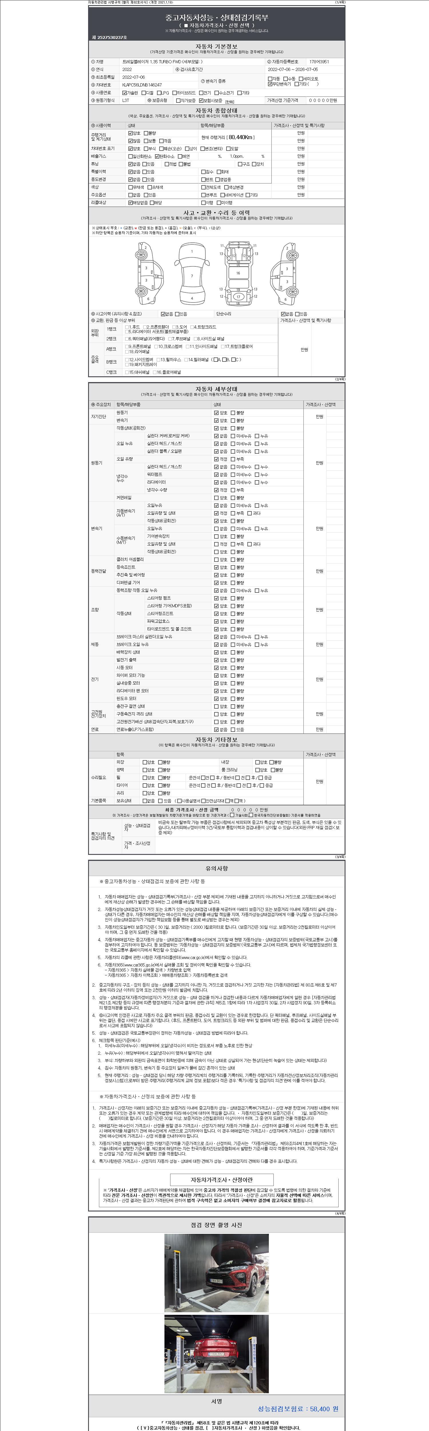 자동차관리법 시행규칙 제120조의 규정에 따라 별지 제 82호서식 《중고자동차 성능, 상태점검 기록부》를 발행한 성능, 상태점검자 및 매매자는 아래의 보증기간 또는 보증거리 이내의 중고자동차, 성능점검 기록부에 기재된 내용과 자동차의 실제 성능, 상태가 다른 경우 계약 또는 관계법령에 따라 매수인에 대하여 책임을 집니다.