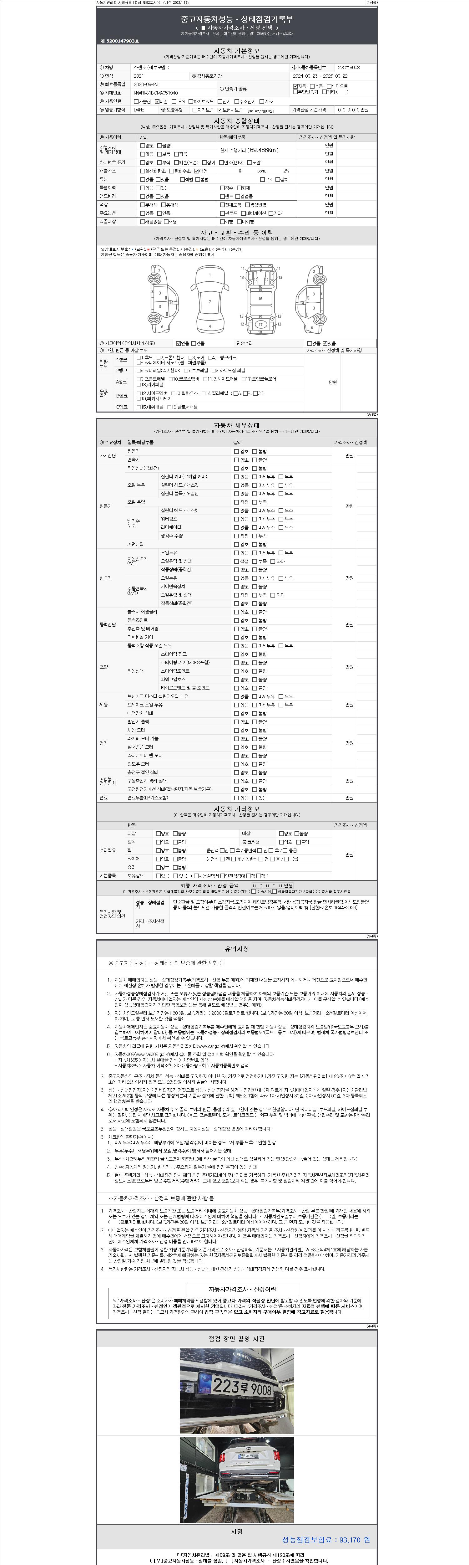 | 주행거리 | 69,466 km | 차량번호 | 223루9008 | 사고유무 | 성능기록부 참조 | 제시번호 | 제 2147483647 호 |