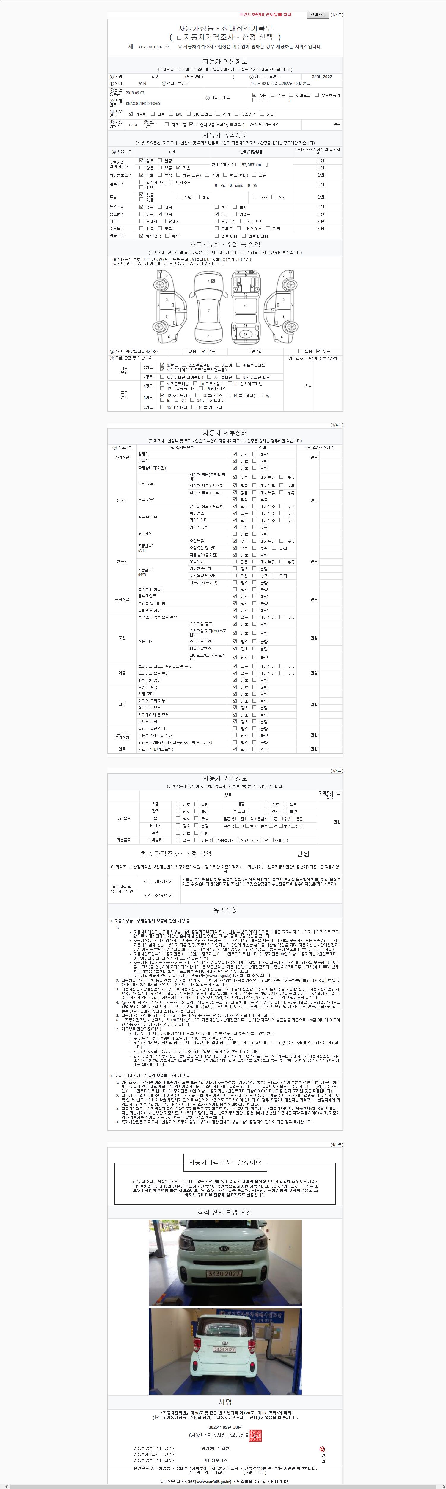 | 주행거리 | 53,386 km | 차량번호 | 343나2027 | 사고유무 | 성능기록부 참조 | 제시번호 | 제 2147483647 호 |
