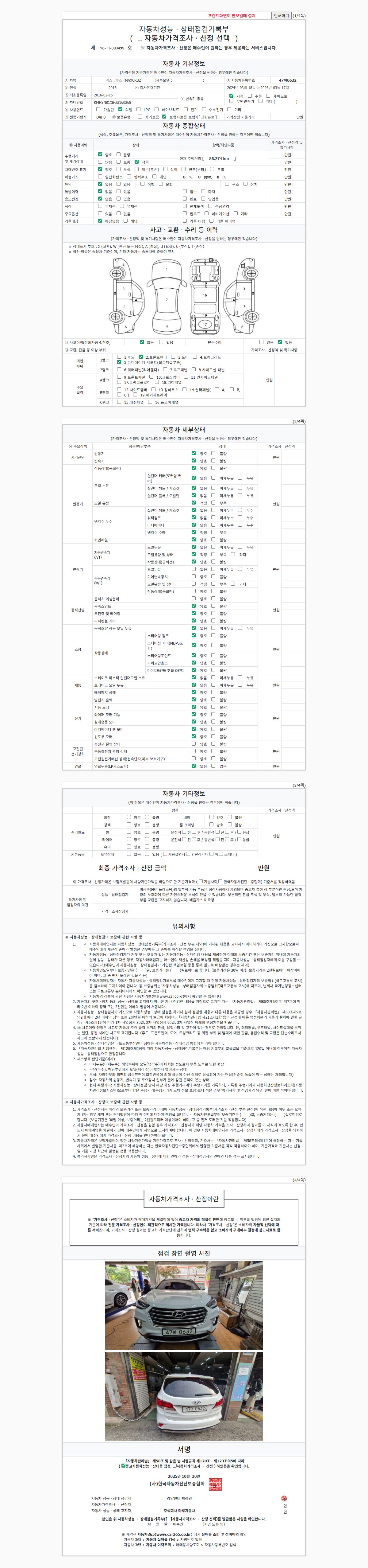 | 주행거리 | 88,274 km | 차량번호 | 47어0632 | 사고유무 | 성능기록부 참조 | 제시번호 | 제 2025145346 호 |