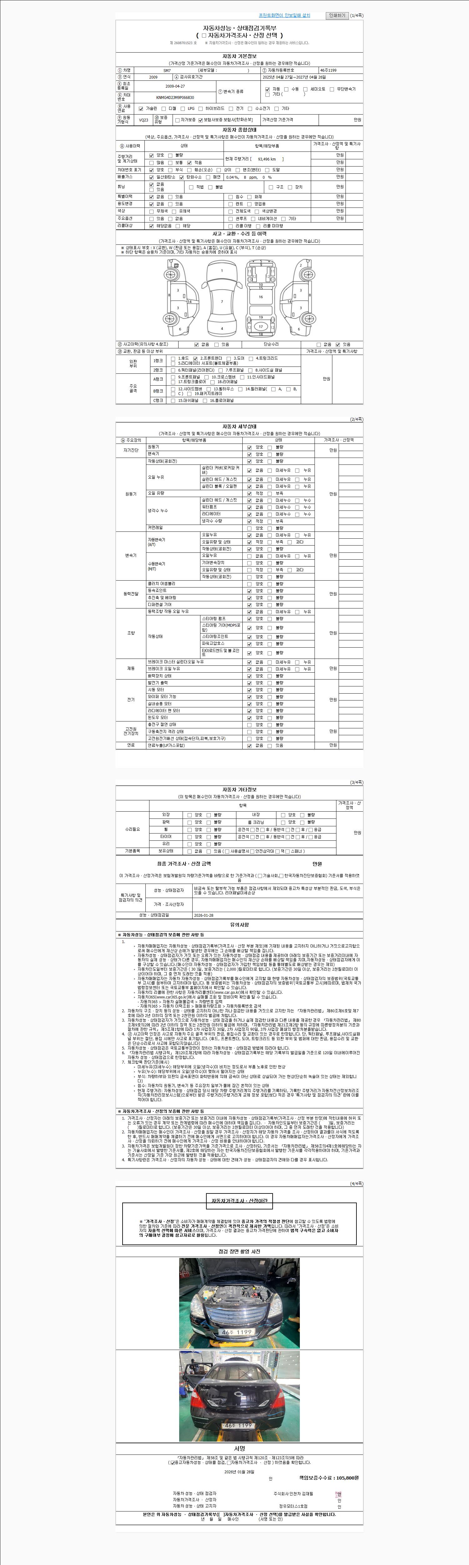 | 주행거리 | 93,496 km | 차량번호 | 46주1199 | 사고유무 | 성능기록부 참조 | 제시번호 | 제 2026004978 호 |