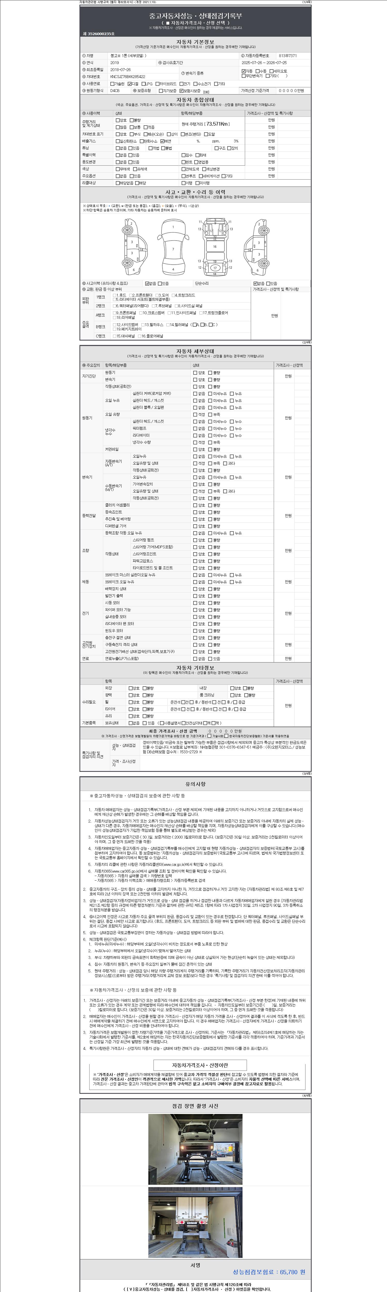 | 주행거리 | 73,517 km | 차량번호 | 813무7371 | 사고유무 | 성능기록부 참조 | 제시번호 | 제 2147483647 호 |