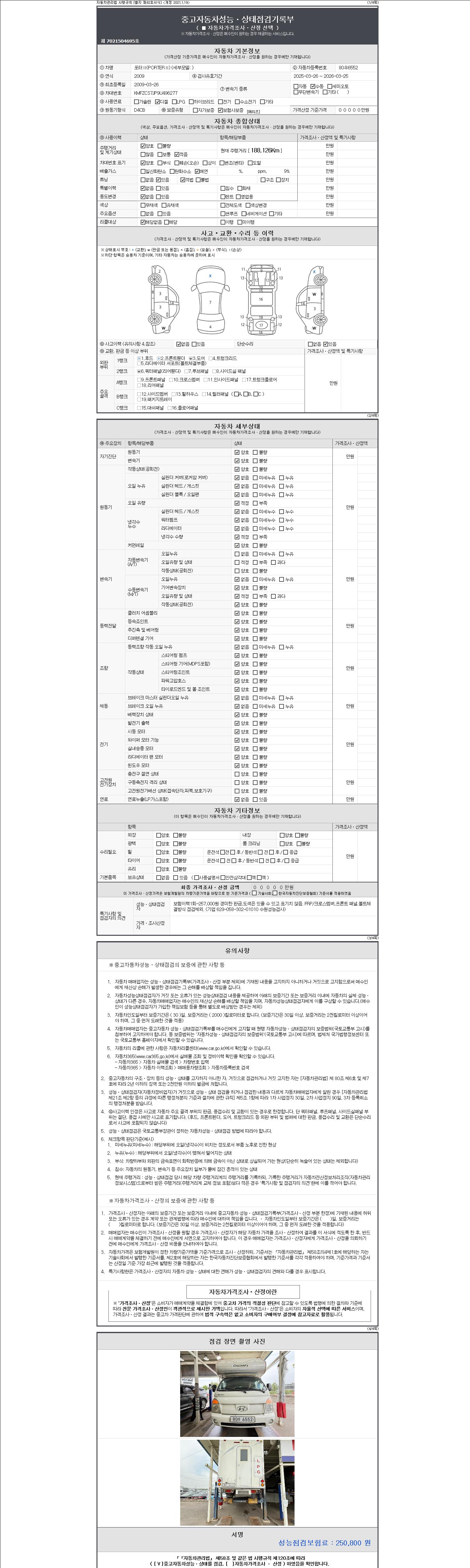 자동차관리법 시행규칙 제120조의 규정에 따라 별지 제 82호서식 《중고자동차 성능, 상태점검 기록부》를 발행한 성능, 상태점검자 및 매매자는 아래의 보증기간 또는 보증거리 이내의 중고자동차, 성능점검 기록부에 기재된 내용과 자동차의 실제 성능, 상태가 다른 경우 계약 또는 관계법령에 따라 매수인에 대하여 책임을 집니다.