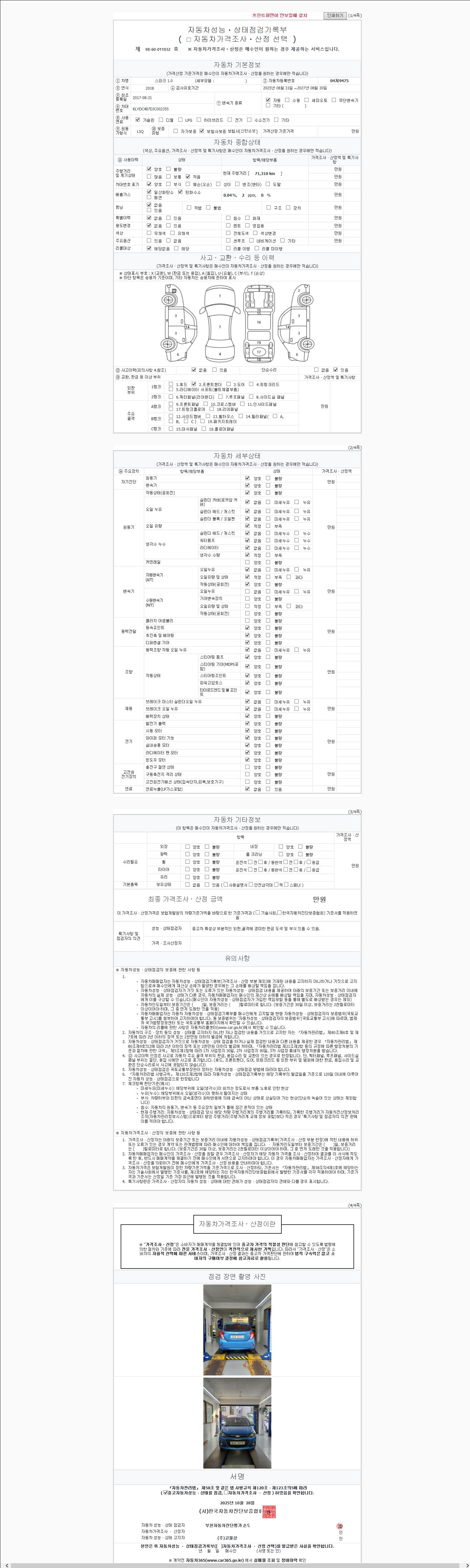 | 주행거리 | 71,310 km | 차량번호 | 04저9475 | 사고유무 | 성능기록부 참조 | 제시번호 | 제 2025197361 호 |