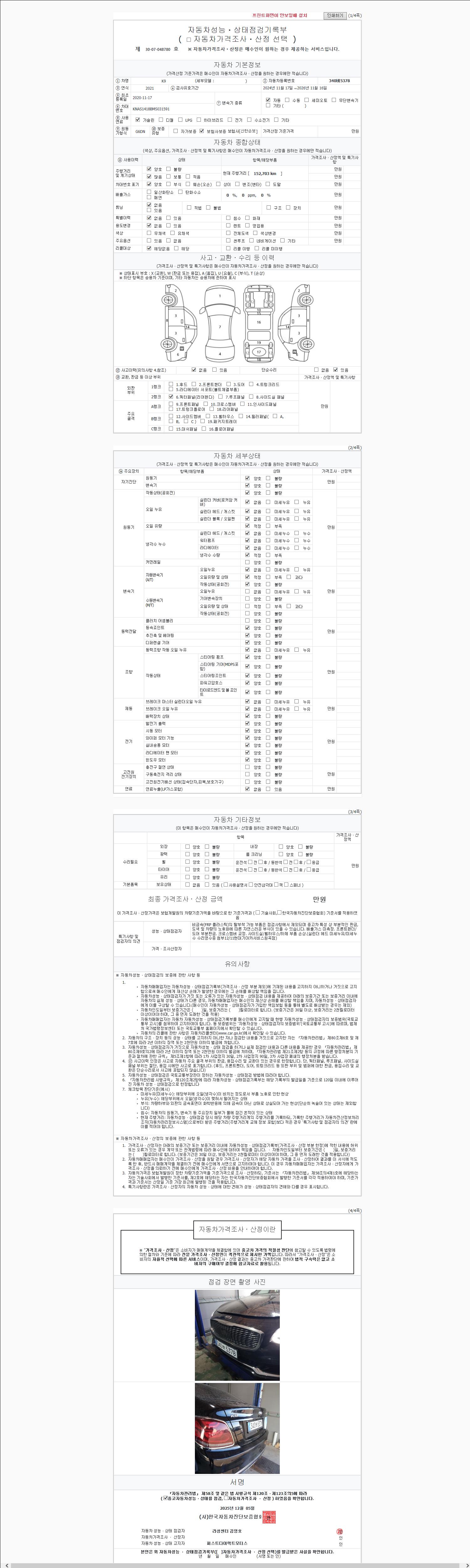 | 주행거리 | 152,722 km | 차량번호 | 340버5378 | 사고유무 | 성능기록부 참조 | 제시번호 | 제 2147483647 호 |