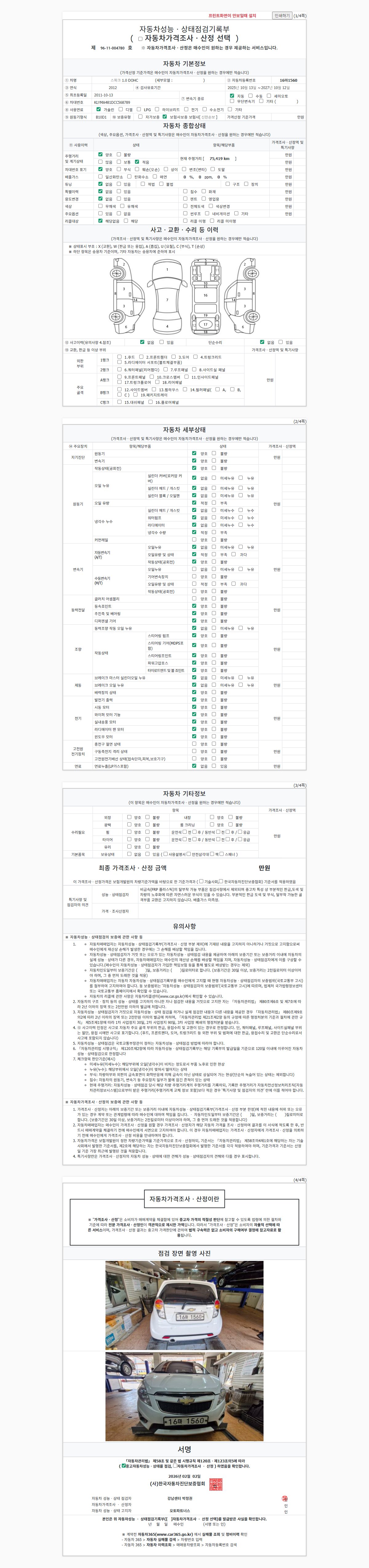 | 주행거리 | 75,419 km | 차량번호 | 16마1560 | 사고유무 | 성능기록부 참조 | 제시번호 | 제 2026013797 호 |