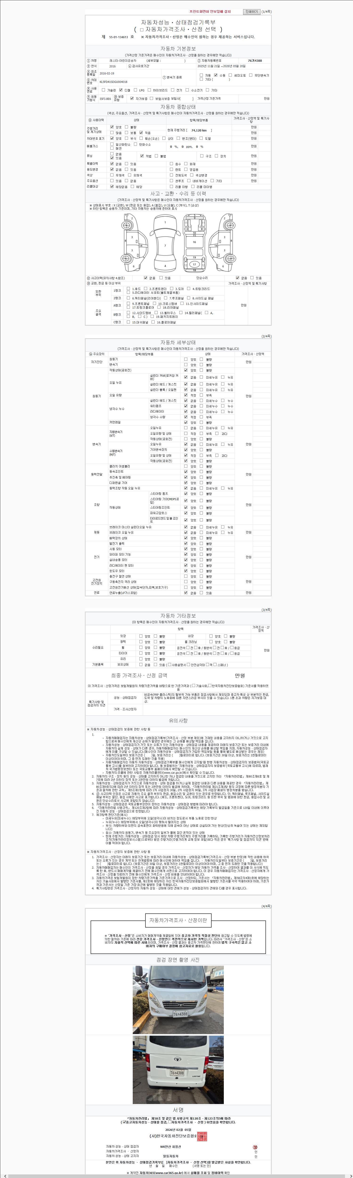 | 주행거리 | 74,050 km | 차량번호 | 76거4388 | 사고유무 | 성능기록부 참조 | 제시번호 | 제 2147483647 호 |