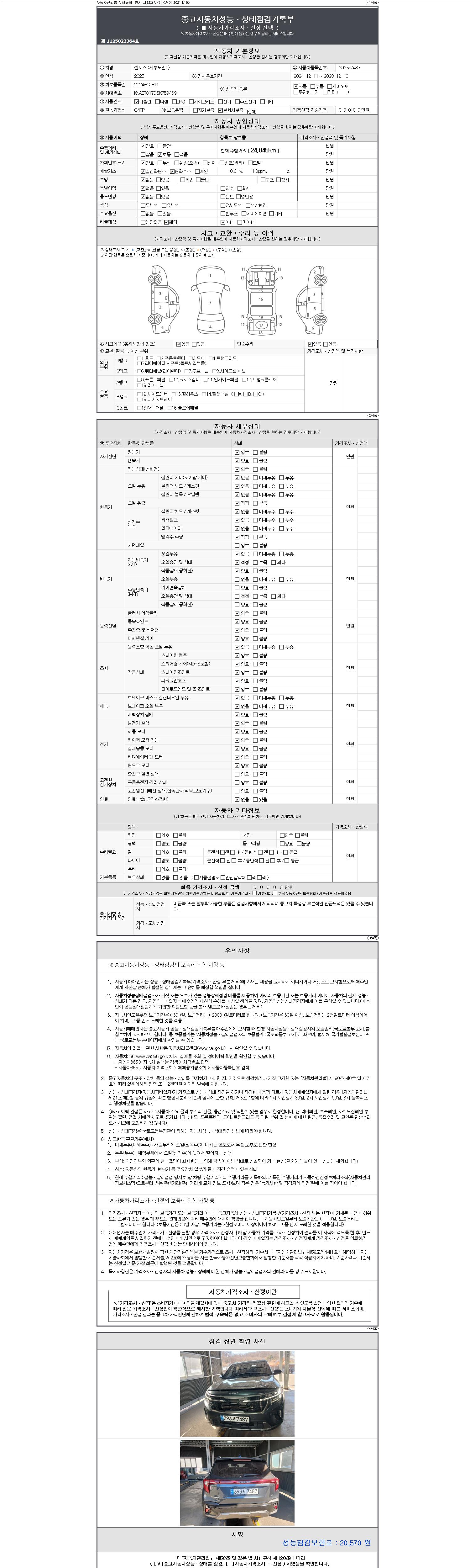 | 주행거리 | 24,845 km | 차량번호 | 393서7487 | 사고유무 | 성능기록부 참조 | 제시번호 | 제 2147483647 호 |