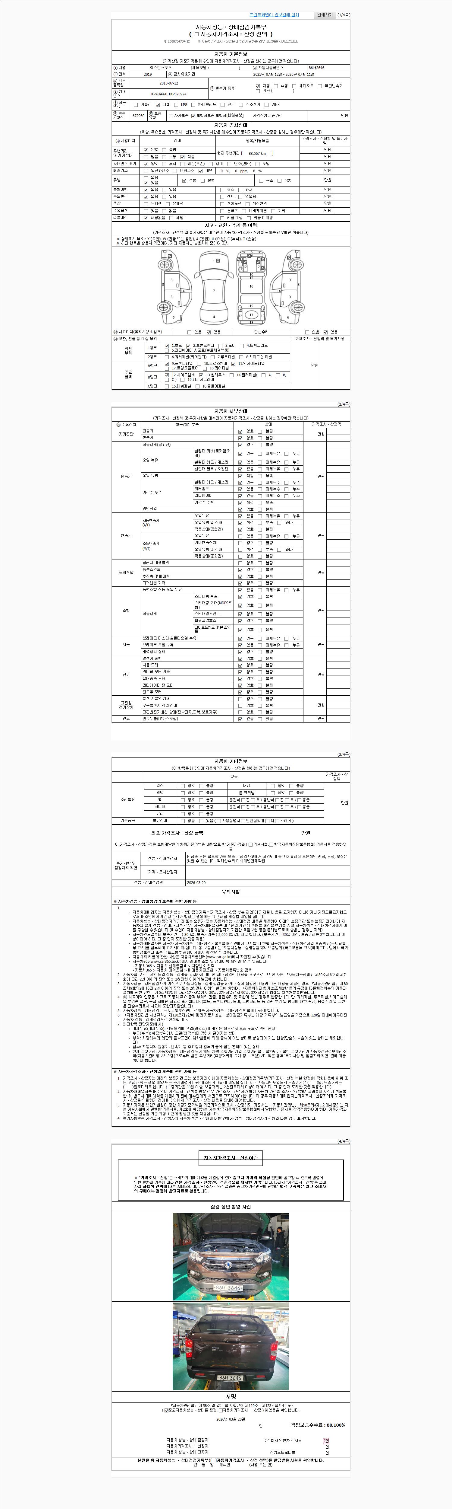 | 주행거리 | 88,857 km | 차량번호 | 86너3646 | 사고유무 | 성능기록부 참조 | 제시번호 | 제 2026014889 호 |