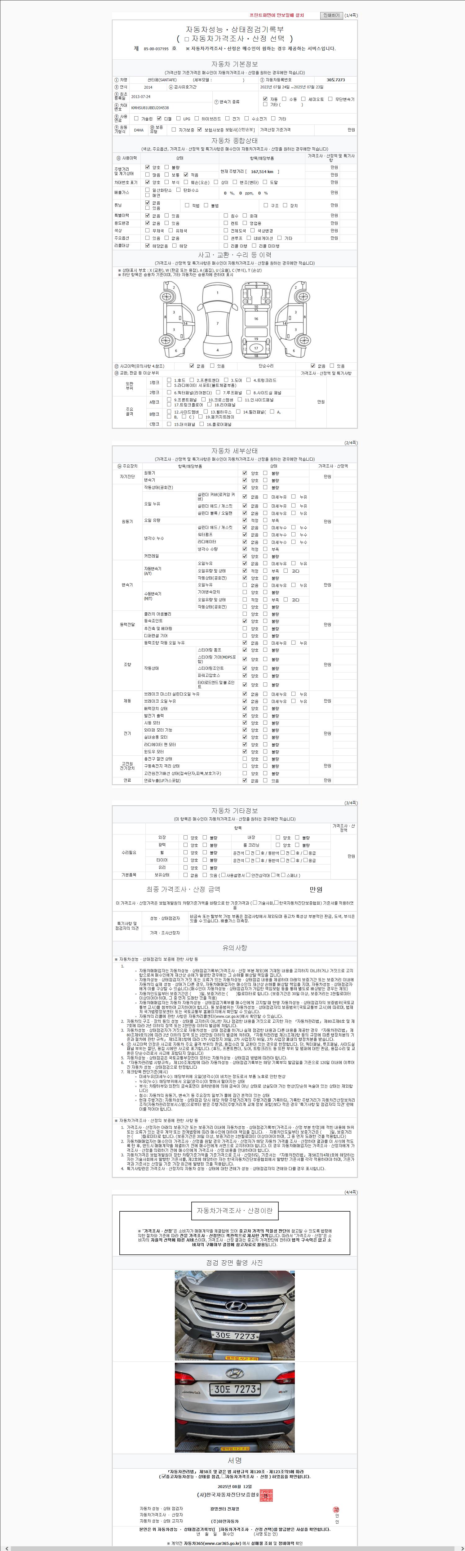 | 주행거리 | 167,514 km | 차량번호 | 30도7273 | 사고유무 | 성능기록부 참조 | 제시번호 | 제 2147483647 호 |