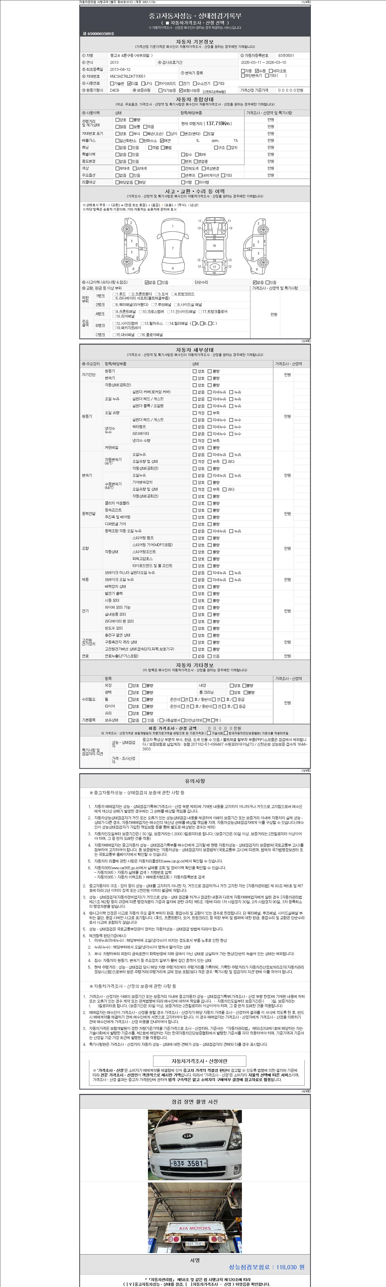 | 주행거리 | 137,718 km | 차량번호 | 83주3581 | 사고유무 | 성능기록부 참조 | 제시번호 | 제 2147483647 호 |