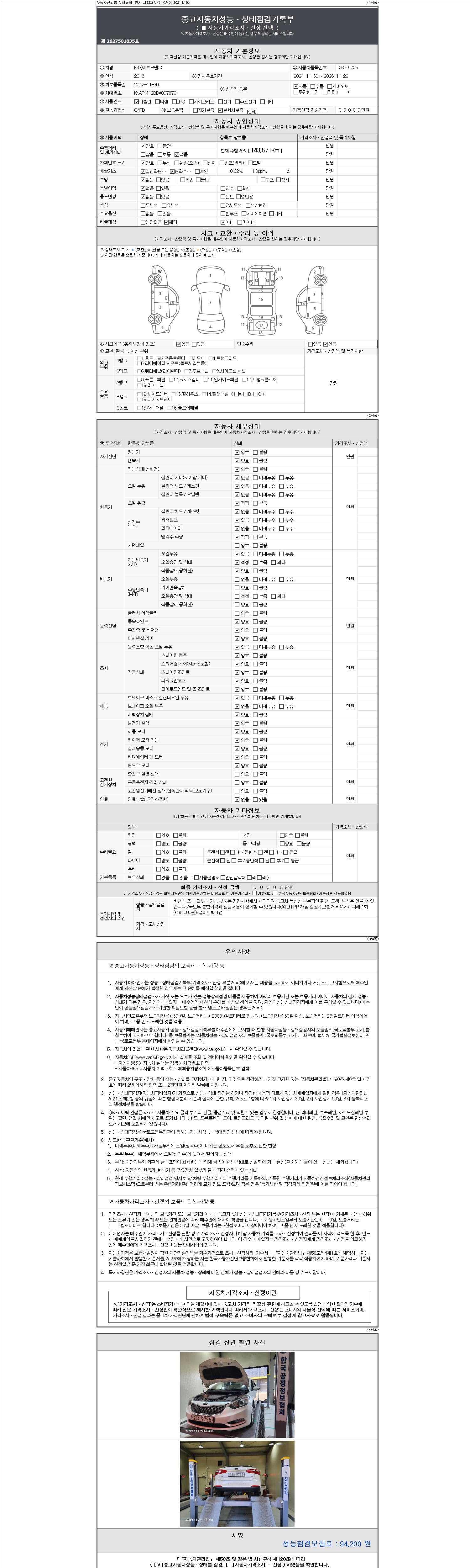 -중고자동차 매매업자를 통해 차량을 구입하실 경우 반드시 "중고자동차 성능, 상태점검 기록부"를 교뷰 받으셔야 하며, 매매업자는 반드시 의무 교부 하여야 압니다.