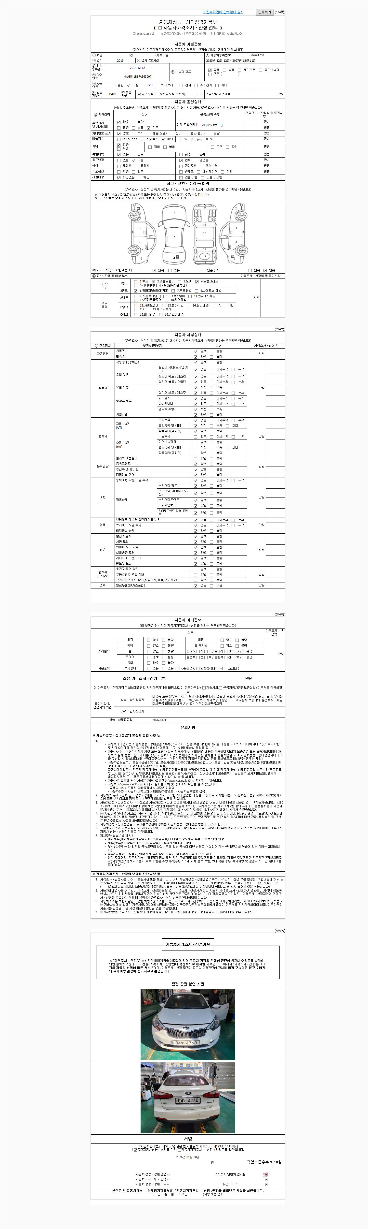 | 주행거리 | 203,046 km | 차량번호 | 04누4760 | 사고유무 | 성능기록부 참조 | 제시번호 | 제 2026006350 호 |