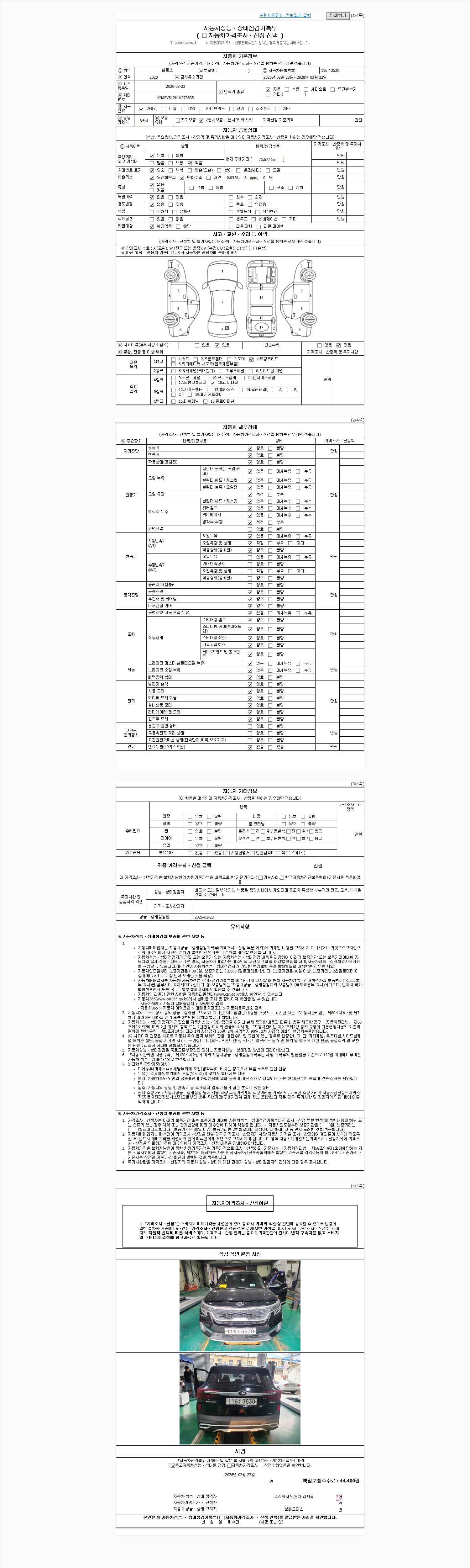 | 주행거리 | 76,677 km | 차량번호 | 116주3530 | 사고유무 | 성능기록부 참조 | 제시번호 | 제 2026009338 호 |