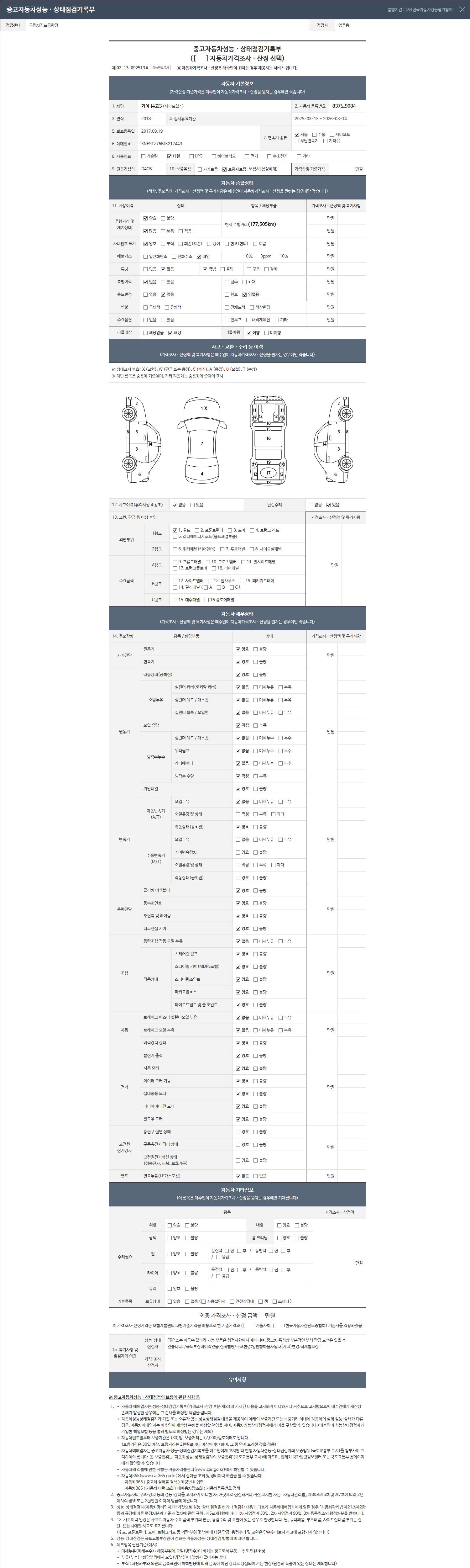 | 주행거리 | 177,505 km | 차량번호 | 837노9084 | 사고유무 | 성능기록부 참조 | 제시번호 | 제 2026032571 호 |