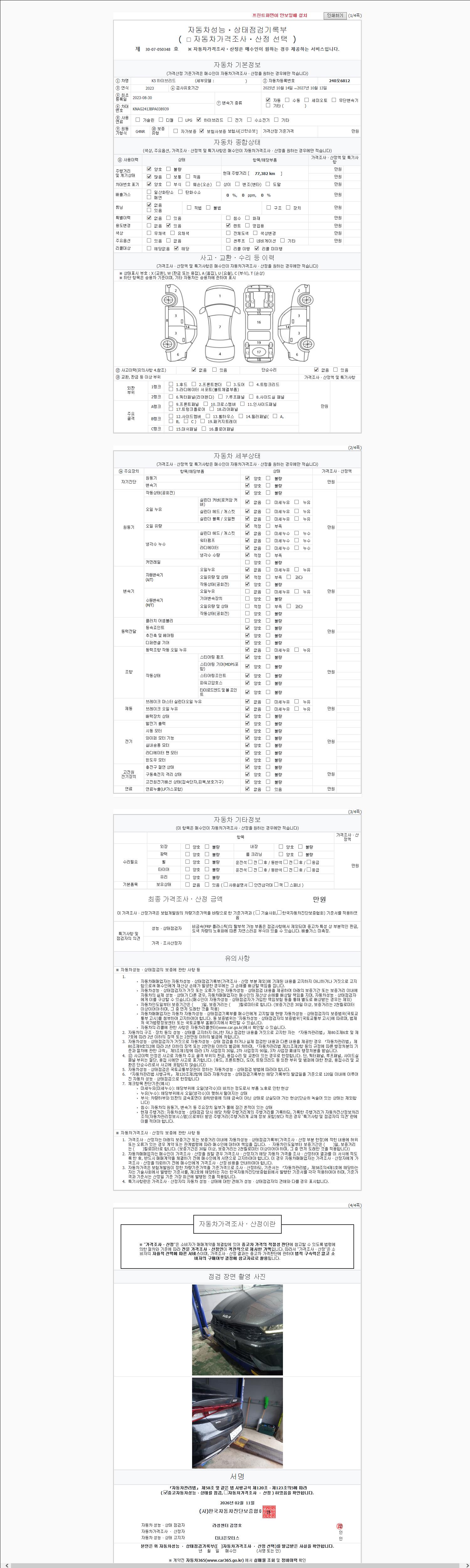 | 주행거리 | 77,378 km | 차량번호 | 240오6812 | 사고유무 | 성능기록부 참조 | 제시번호 | 제 2147483647 호 |