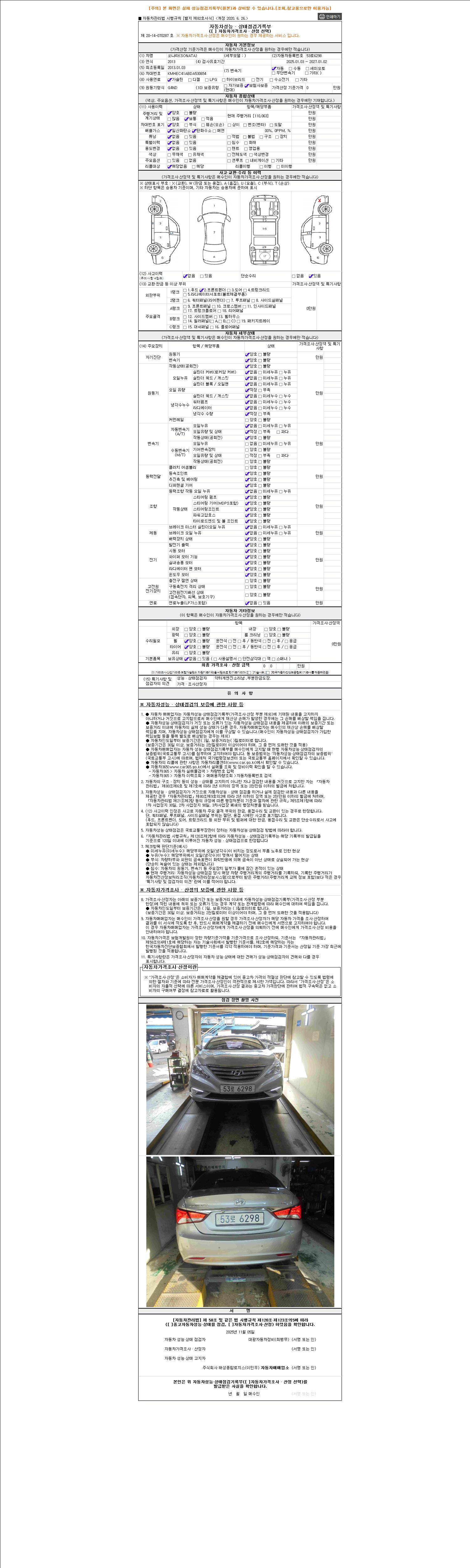 | 주행거리 | 110,063 km | 차량번호 | 53로6298 | 사고유무 | 성능기록부 참조 | 제시번호 | 제 2025141634 호 |