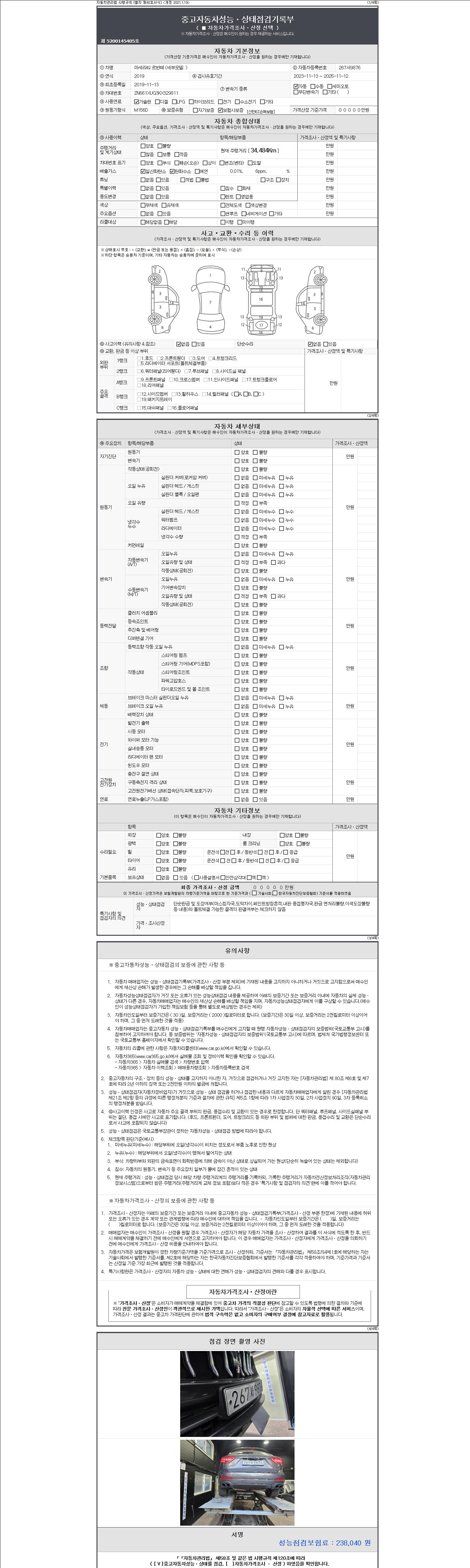 | 주행거리 | 34,484 km | 차량번호 | 267서9876 | 사고유무 | 성능기록부 참조 | 제시번호 | 제 2147483647 호 |