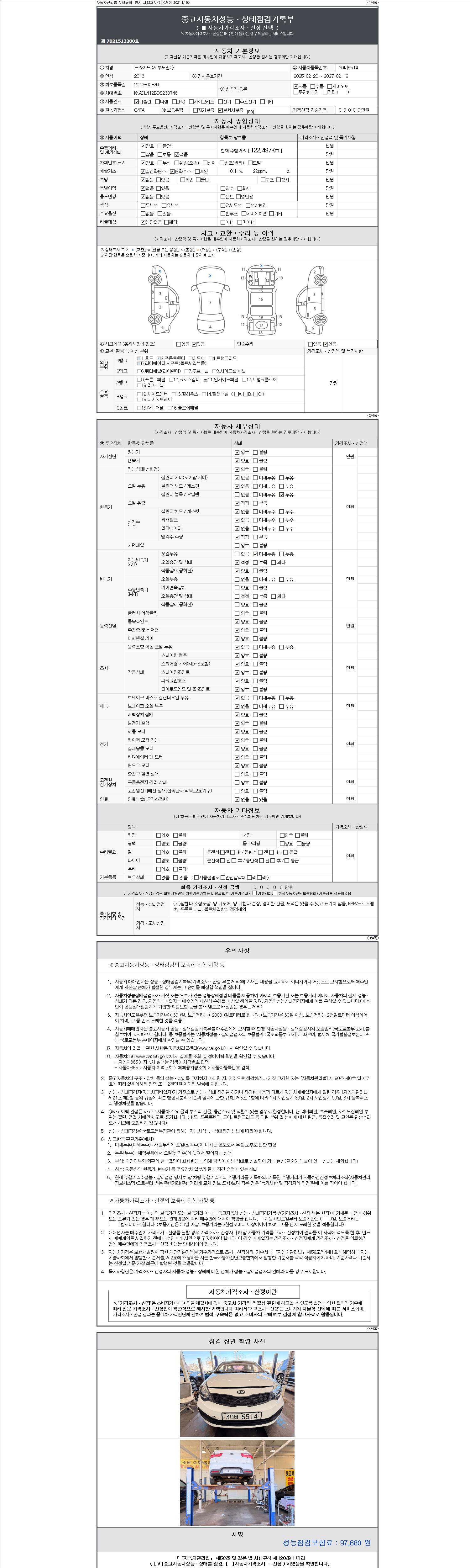 -중고자동차 매매업자를 통해 차량을 구입하실 경우 반드시 "중고자동차 성능, 상태점검 기록부"를 교뷰 받으셔야 하며, 매매업자는 반드시 의무 교부 하여야 압니다.