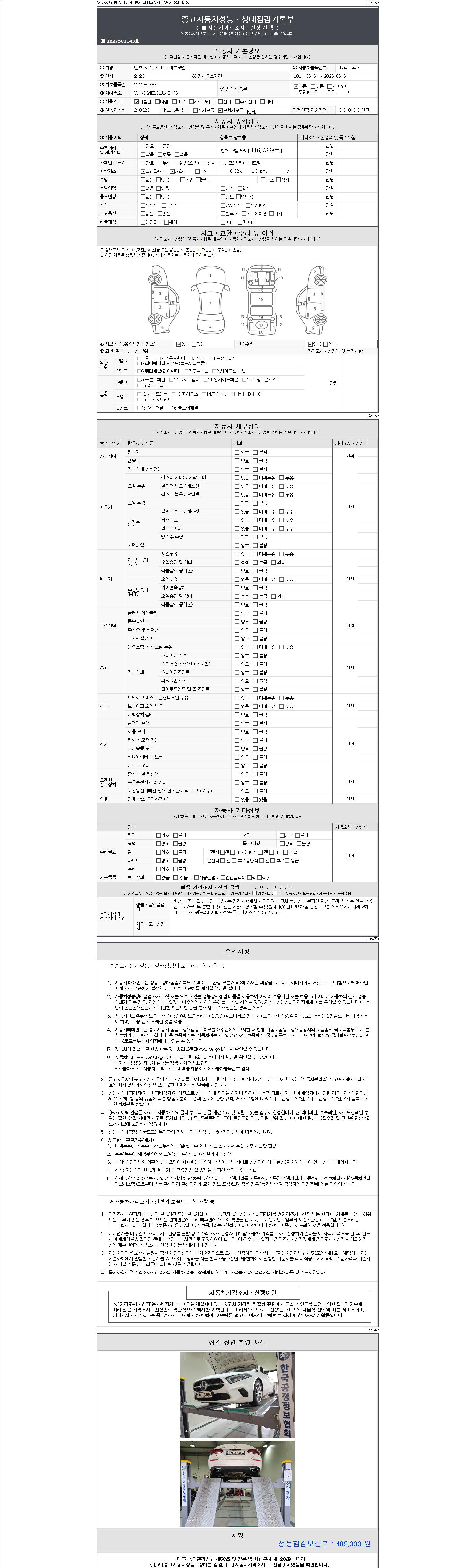 자동차관리법 시행규칙 제120조의 규정에 따라 별지 제 82호서식 《중고자동차 성능, 상태점검 기록부》를 발행한 성능, 상태점검자 및 매매자는 아래의 보증기간 또는 보증거리 이내의 중고자동차, 성능점검 기록부에 기재된 내용과 자동차의 실제 성능, 상태가 다른 경우 계약 또는 관계법령에 따라 매수인에 대하여 책임을 집니다.