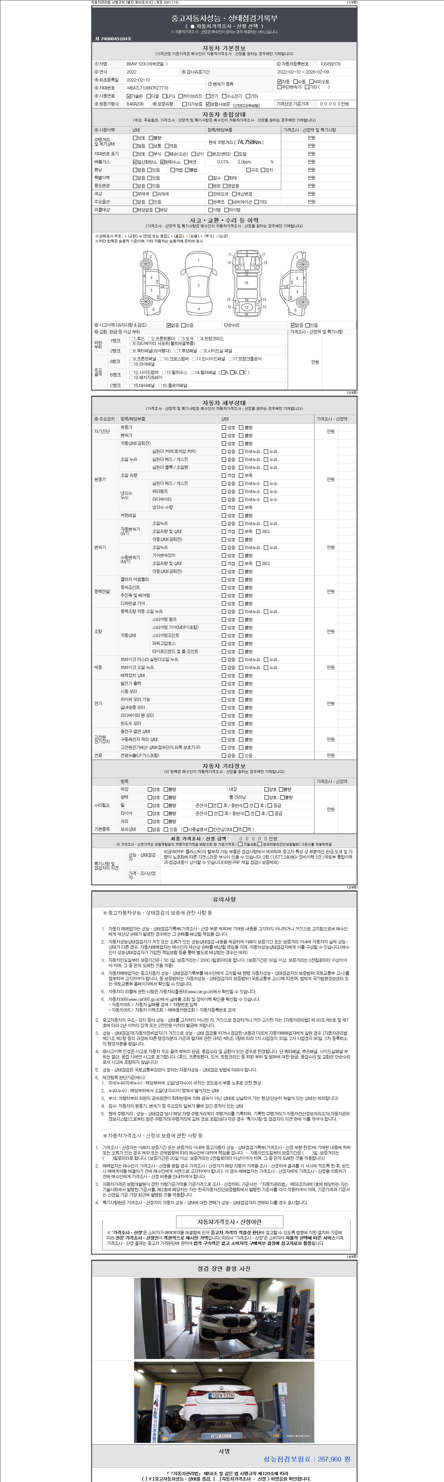 자동차관리법 시행규칙 제120조의 규정에 따라 별지 제 82호서식 《중고자동차 성능, 상태점검 기록부》를 발행한 성능, 상태점검자 및 매매자는 아래의 보증기간 또는 보증거리 이내의 중고자동차, 성능점검 기록부에 기재된 내용과 자동차의 실제 성능, 상태가 다른 경우 계약 또는 관계법령에 따라 매수인에 대하여 책임을 집니다.