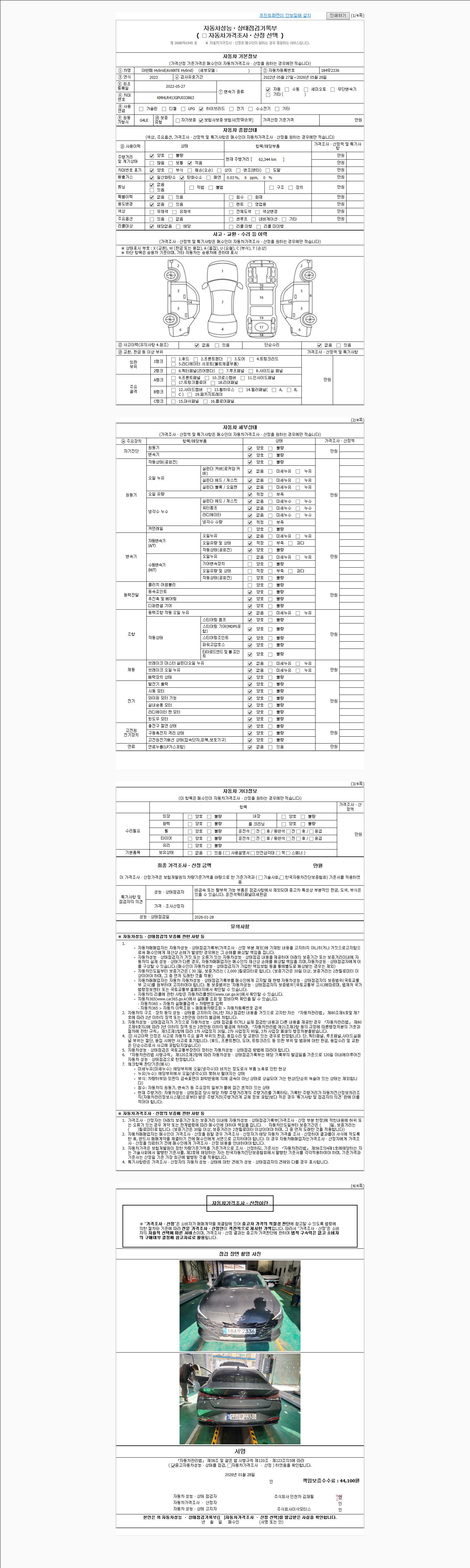 | 주행거리 | 62,344 km | 차량번호 | 184무2336 | 사고유무 | 성능기록부 참조 | 제시번호 | 제 2026005587 호 |