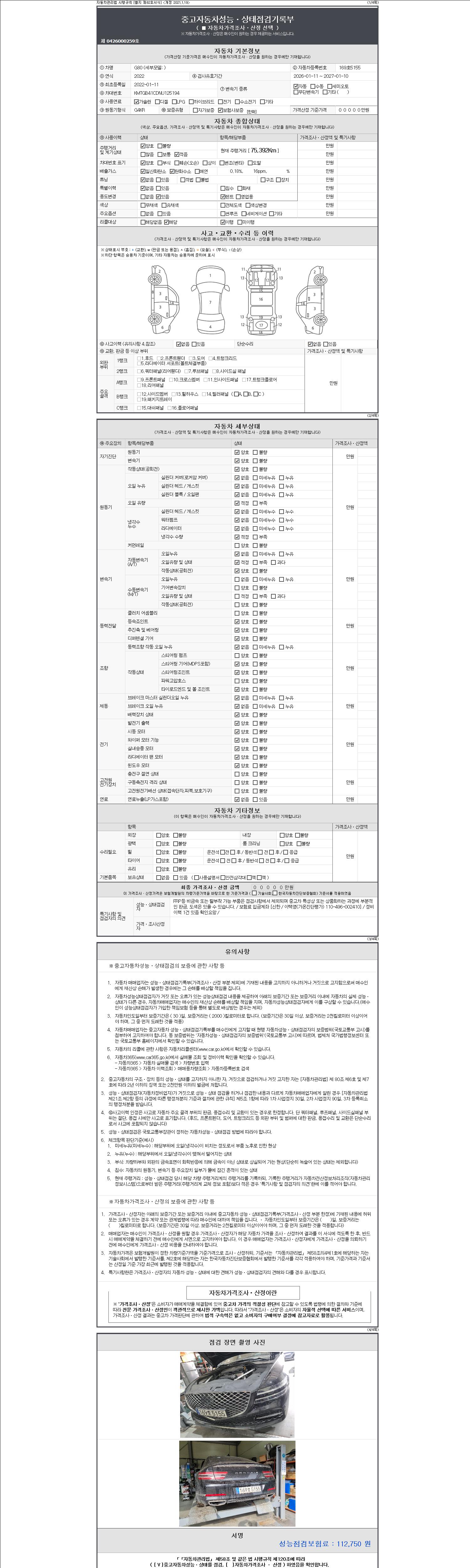 자동차관리법 시행규칙 제120조의 규정에 따라 별지 제 82호서식 《중고자동차 성능, 상태점검 기록부》를 발행한 성능, 상태점검자 및 매매자는 아래의 보증기간 또는 보증거리 이내의 중고자동차, 성능점검 기록부에 기재된 내용과 자동차의 실제 성능, 상태가 다른 경우 계약 또는 관계법령에 따라 매수인에 대하여 책임을 집니다.