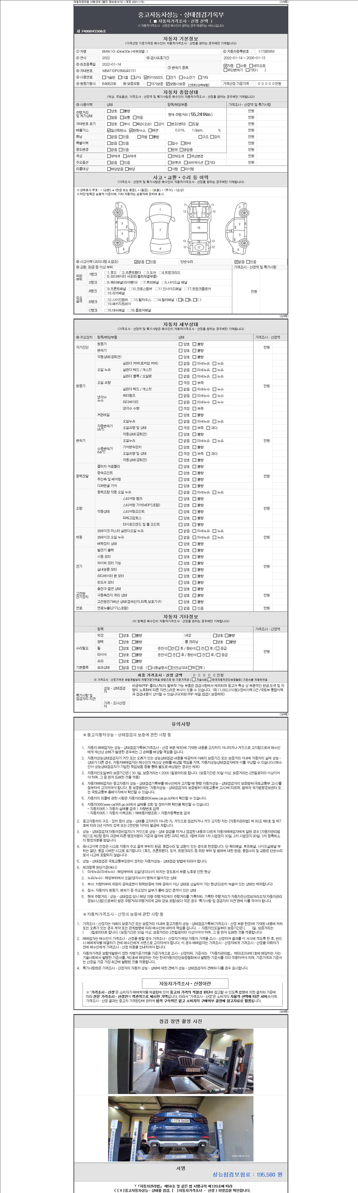 자동차관리법 시행규칙 제120조의 규정에 따라 별지 제 82호서식 《중고자동차 성능, 상태점검 기록부》를 발행한 성능, 상태점검자 및 매매자는 아래의 보증기간 또는 보증거리 이내의 중고자동차, 성능점검 기록부에 기재된 내용과 자동차의 실제 성능, 상태가 다른 경우 계약 또는 관계법령에 따라 매수인에 대하여 책임을 집니다.