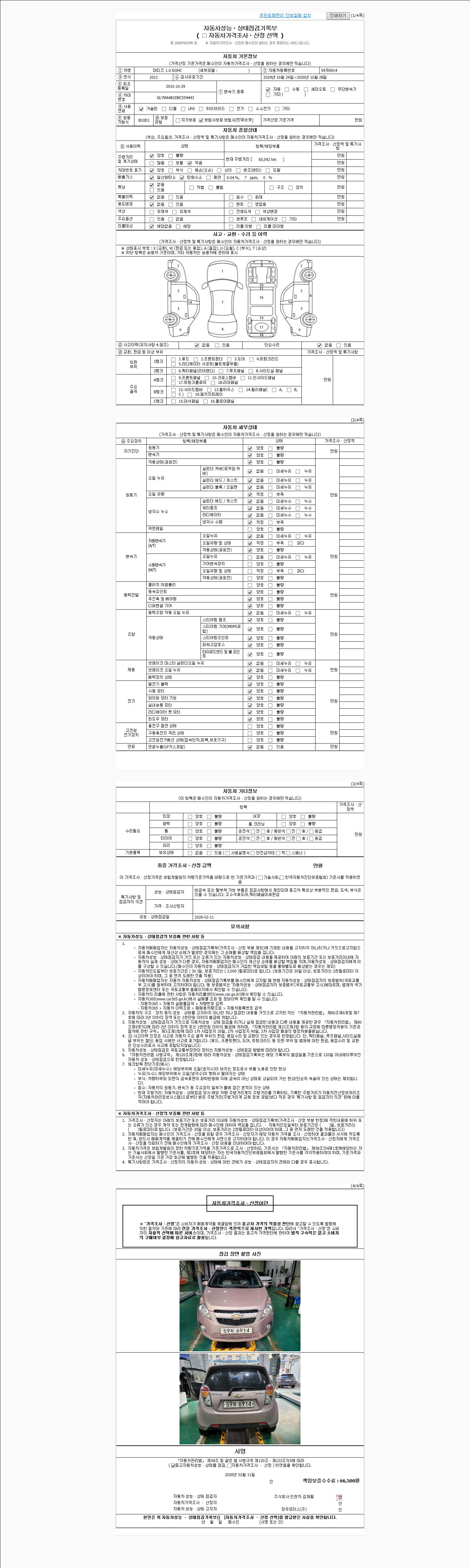 | 주행거리 | 65,092 km | 차량번호 | 59저6914 | 사고유무 | 성능기록부 참조 | 제시번호 | 제 2026007800 호 |