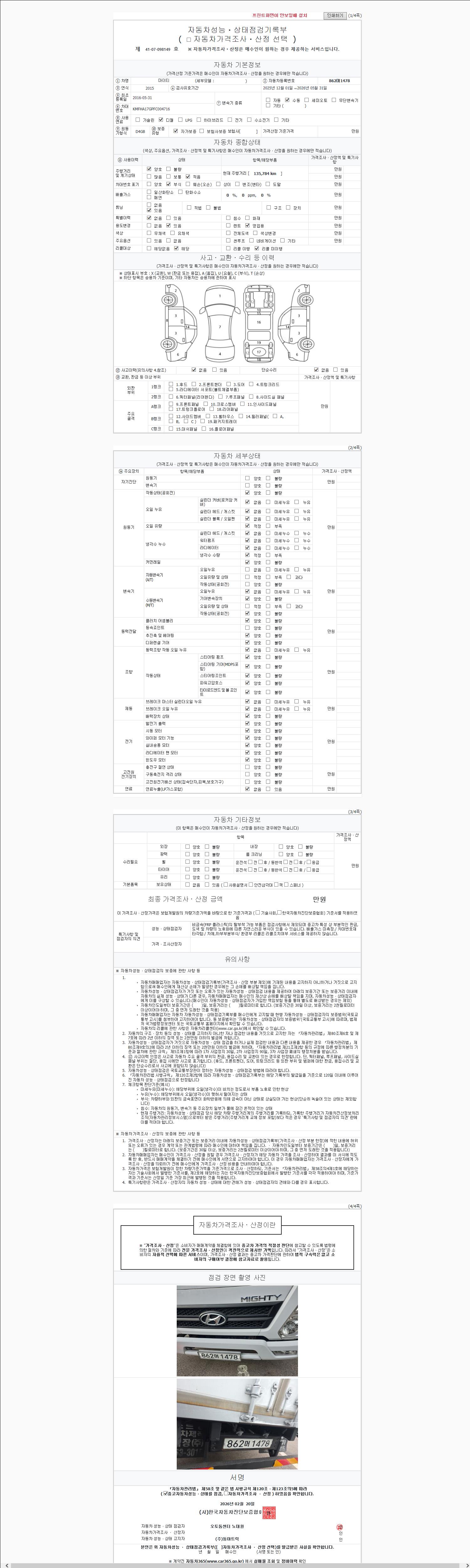| 주행거리 | 135,377 km | 차량번호 | 862머1478 | 사고유무 | 성능기록부 참조 | 제시번호 | 제 2147483647 호 |