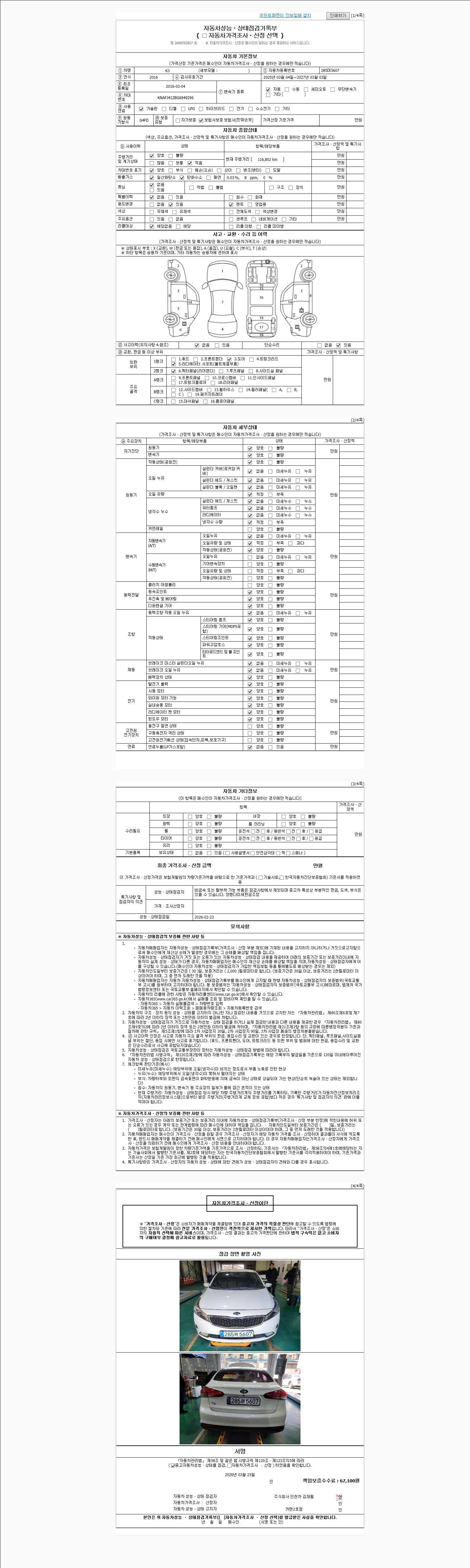 | 주행거리 | 116,802 km | 차량번호 | 285머5607 | 사고유무 | 성능기록부 참조 | 제시번호 | 제 2026009169 호 |