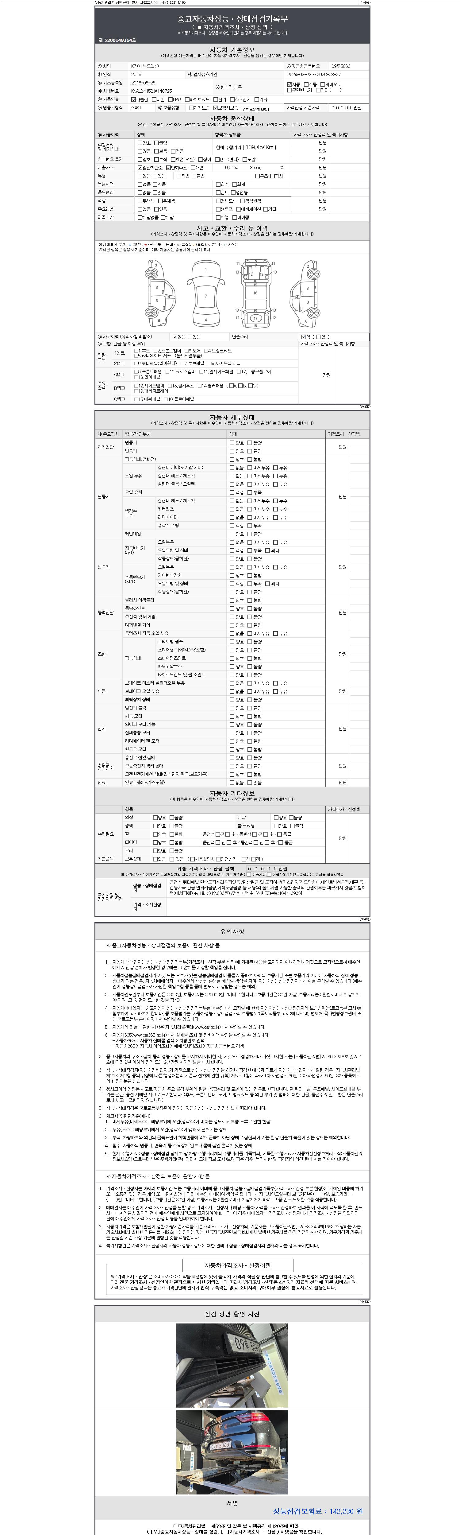 자동차관리법 시행규칙 제120조의 규정에 따라 별지 제 82호서식 《중고자동차 성능, 상태점검 기록부》를 발행한 성능, 상태점검자 및 매매자는 아래의 보증기간 또는 보증거리 이내의 중고자동차, 성능점검 기록부에 기재된 내용과 자동차의 실제 성능, 상태가 다른 경우 계약 또는 관계법령에 따라 매수인에 대하여 책임을 집니다.