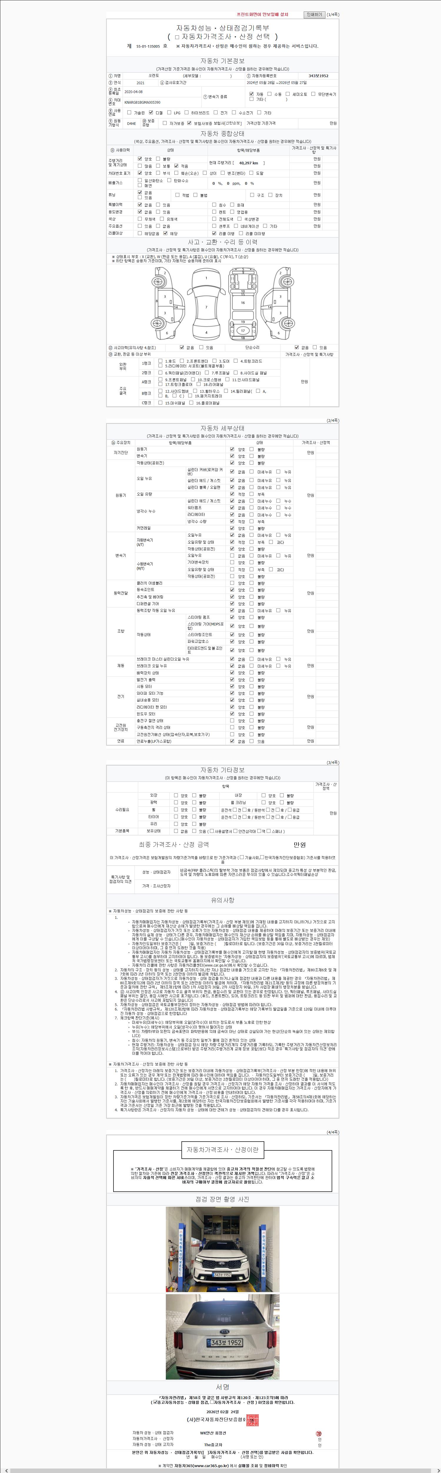 | 주행거리 | 40,297 km | 차량번호 | 343보1952 | 사고유무 | 성능기록부 참조 | 제시번호 | 제 2147483647 호 |