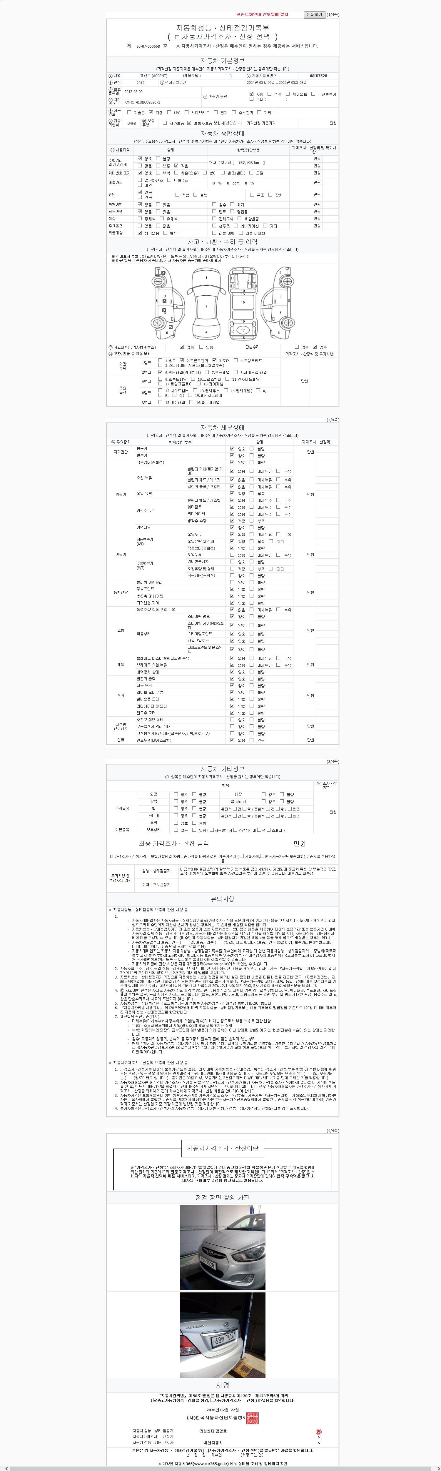 -중고자동차 매매업자를 통해 차량을 구입하실 경우 반드시 "중고자동차 성능, 상태점검 기록부"를 교뷰 받으셔야 하며, 매매업자는 반드시 의무 교부 하여야 압니다.