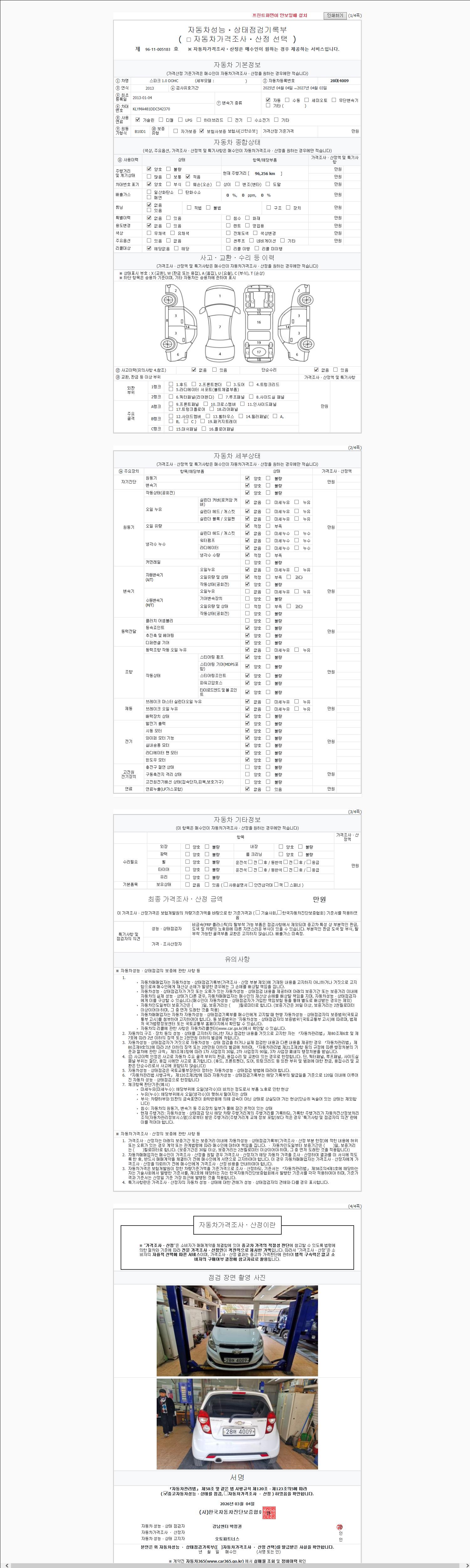 | 주행거리 | 96,256 km | 차량번호 | 28어4009 | 사고유무 | 성능기록부 참조 | 제시번호 | 제 2026027220 호 |