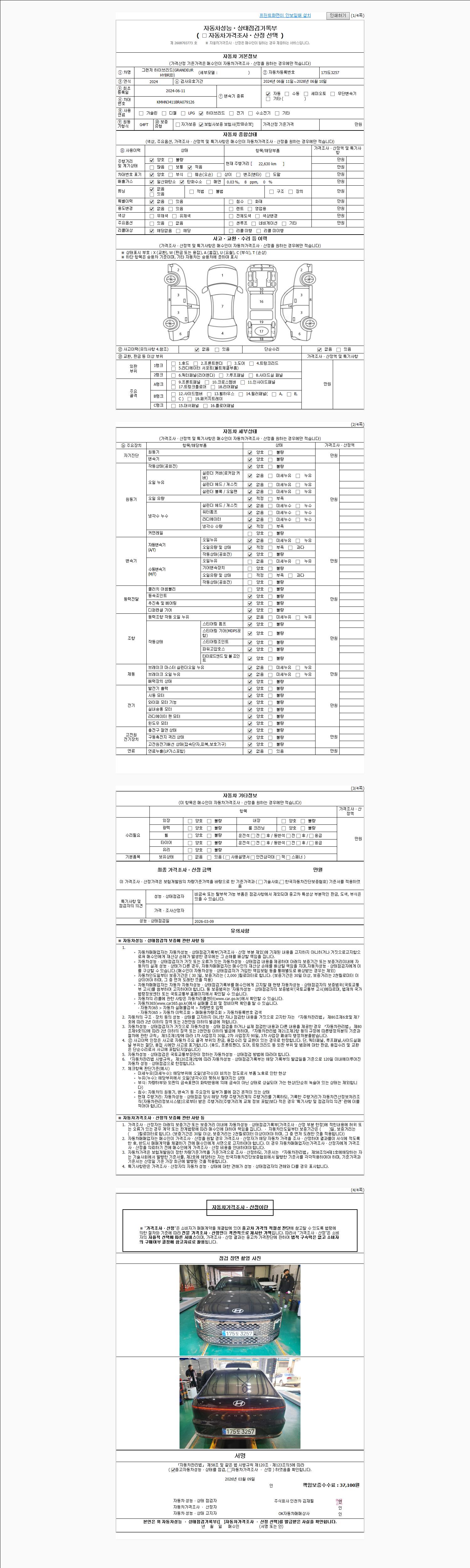 | 주행거리 | 22,630 km | 차량번호 | 175도3257 | 사고유무 | 성능기록부 참조 | 제시번호 | 제 2026011970 호 |