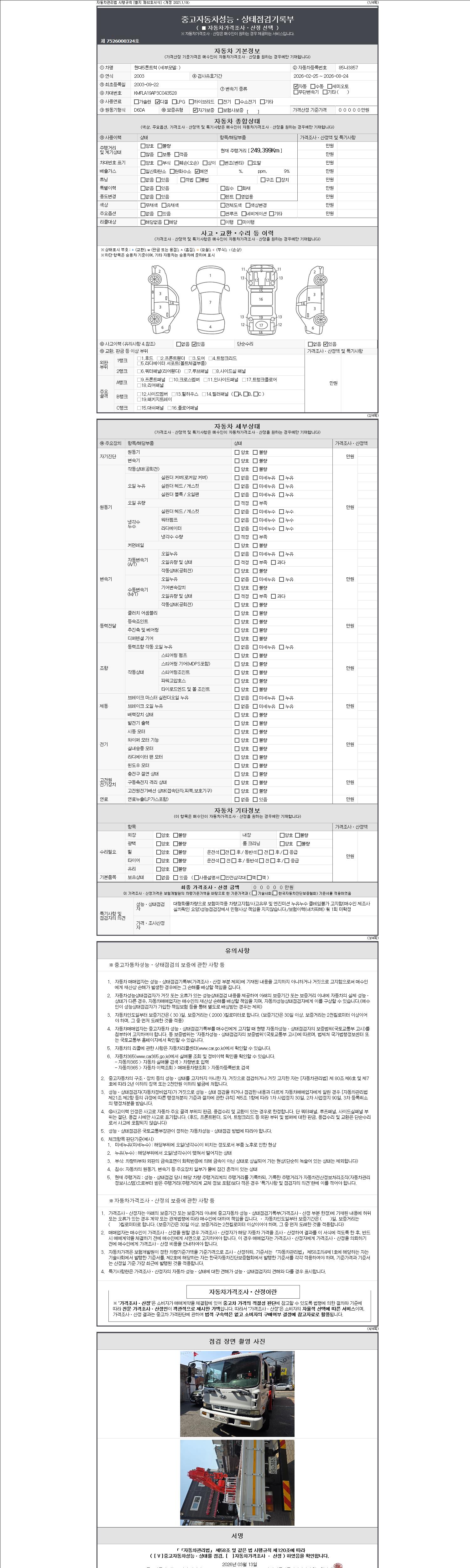 | 주행거리 | 249,399 km | 차량번호 | 85나3857 | 사고유무 | 성능기록부 참조 | 제시번호 | 제 2147483647 호 |